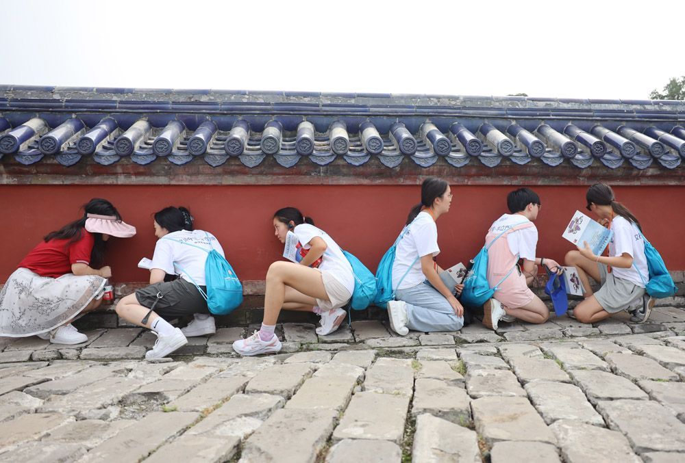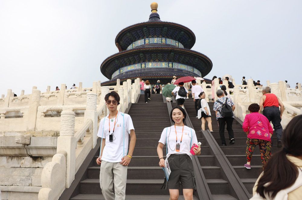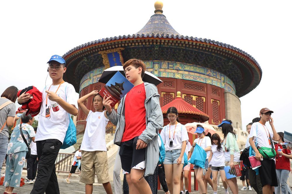 2023年8月4日,在北京参加“水立方杯”音乐夏令营的营员们在天坛景区内参观。