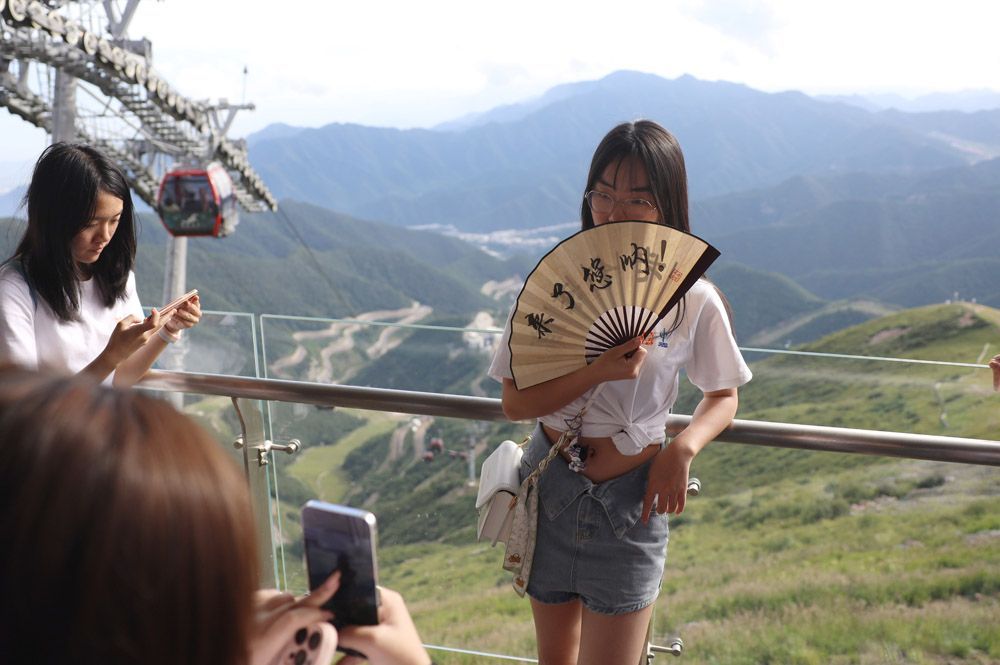 2023年8月4日,“来了您呐!”一名营员手持折扇在北京延庆奥林匹克公园内打卡留影。