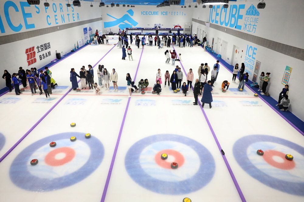2023年8月5日,“水立方杯”音乐夏令营的营员们在北京“冰立方”体验冰壶运动。