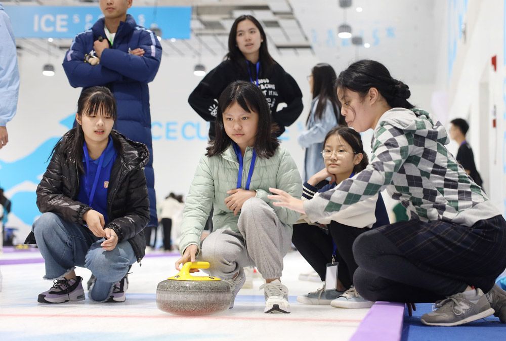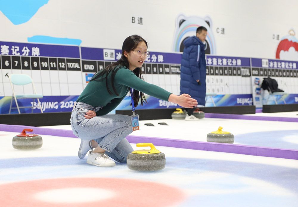 夏日的北京“热情奔放”,但中国国家游泳馆(冰立方/水立方)的冰壶场馆却清凉宜人,营员们在这里沉浸式体验冬奥比赛项目。在向营员们讲解如何推动冰壶得分的规则和要领后,教练们把营员分到八个赛场,各自分为两组,展开冰壶比赛。来自法国的管琪乐每次都能将冰壶推进目标中心,为自己的队伍赢下分数。