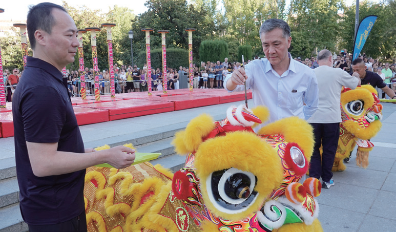 8月5日20时,马德里“城市之夏”艺术节总监安赫尔·穆尔西亚(Angel Murcia)、中国驻西班牙大使馆文化公参贺踊、马德里中国文化中心主任杨长青及深圳市委和文广电旅体局代表在东方广场参加点睛仪式,为醒狮点睛。