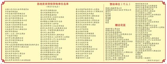 讲话环节结束后,意大利南部文成同乡总会NAPOLI执行会长胡志岸宣读全国人民代表大会华侨委员会发来的贺电,意大利南部文成同乡总会第一常务副会长周明垟宣读中华海外联谊会贺电,意大利南部文成同乡总会理事长陈佳雨宣读欧洲及意大利各侨团发来的贺电,意大利南部文成同乡总会会长助理吴德武宣读各侨团赠送的花篮和个人赞助名单,意大利南部文成同乡总会秘书长黄荣军宣读理事会会长团成员名单。