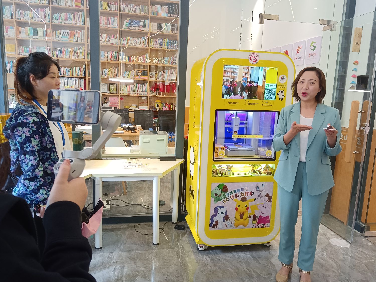 图为金银山少儿活动中心负责人向媒体团一行介绍活动中心的3D打印巧克力机。