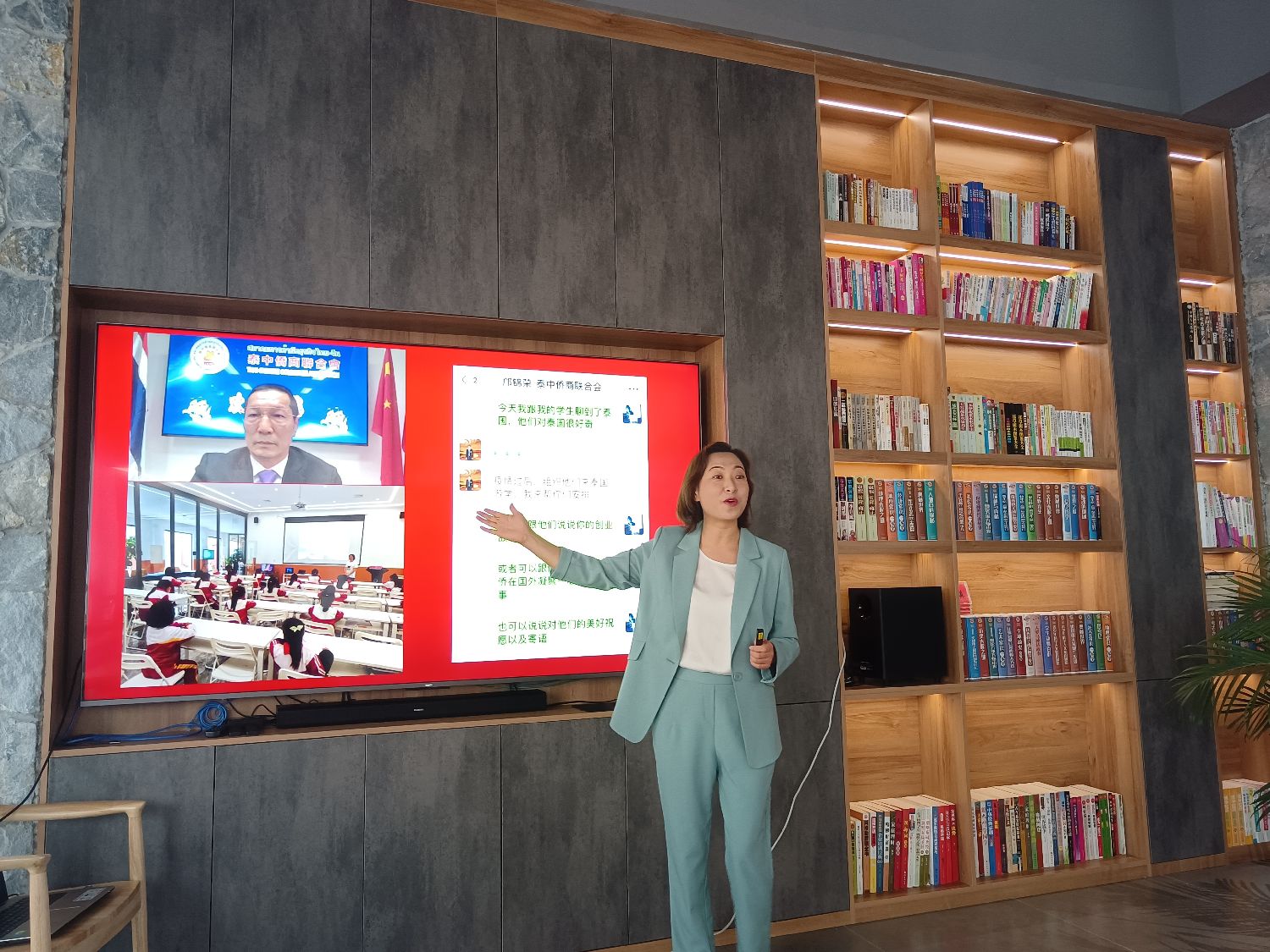 图为金银山少儿活动中心负责人向媒体团一行介绍海外侨胞与活动中心的互动情况。