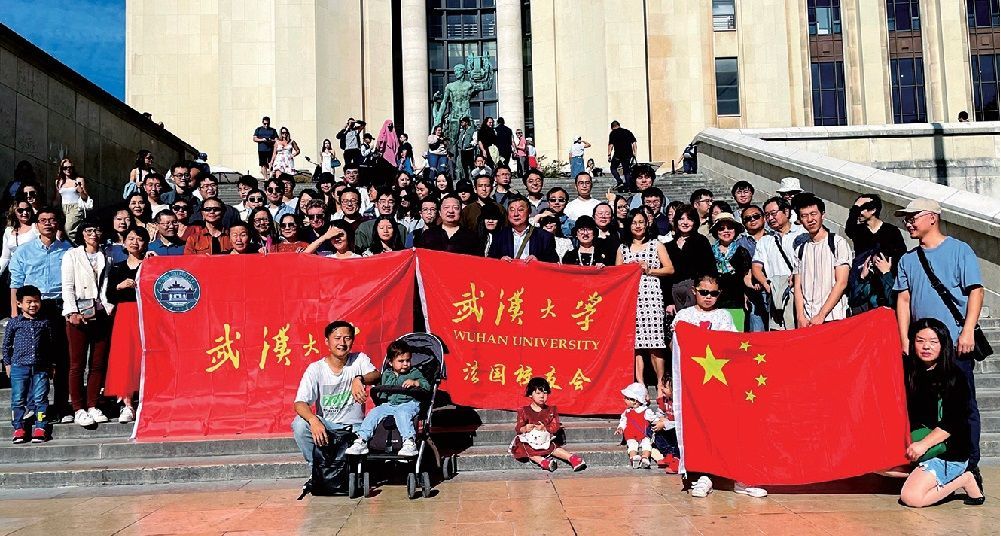 80余名在法的武汉大学校友手持五星红旗、武汉大学校旗、武汉大学法国校友会会旗,振臂高呼:“祝祖国生日快乐!祝母校生日快乐!”