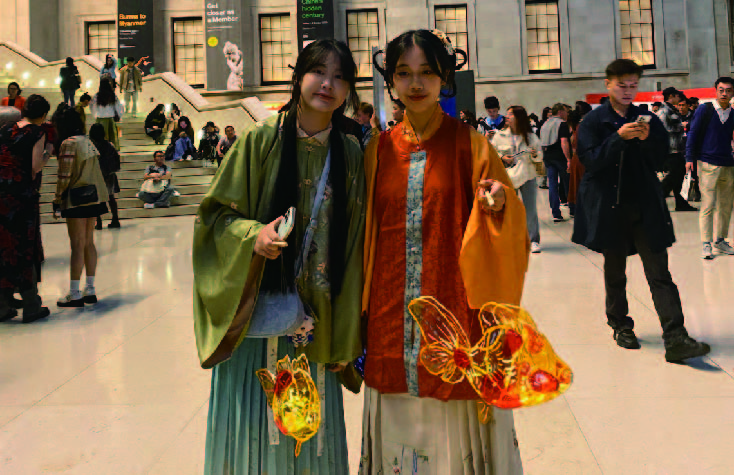 留学生Carmen和朋友身着汉服,带着自制的金鱼灯笼来到大英博物馆庆祝中秋。(图片来源:欧洲时报实习记者甘崇瑾摄)