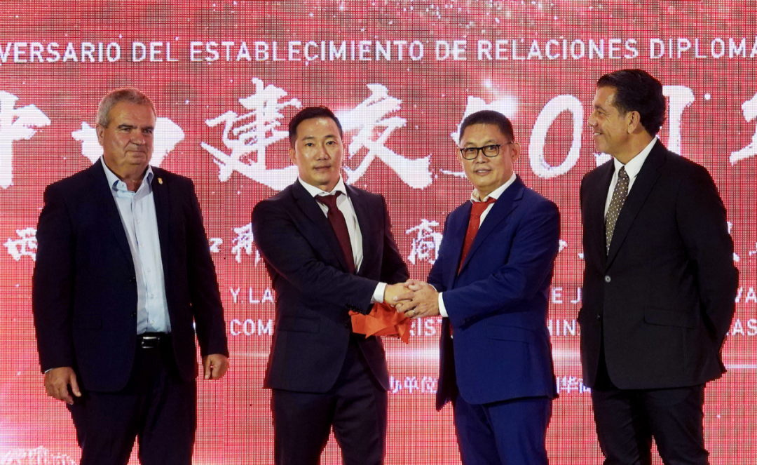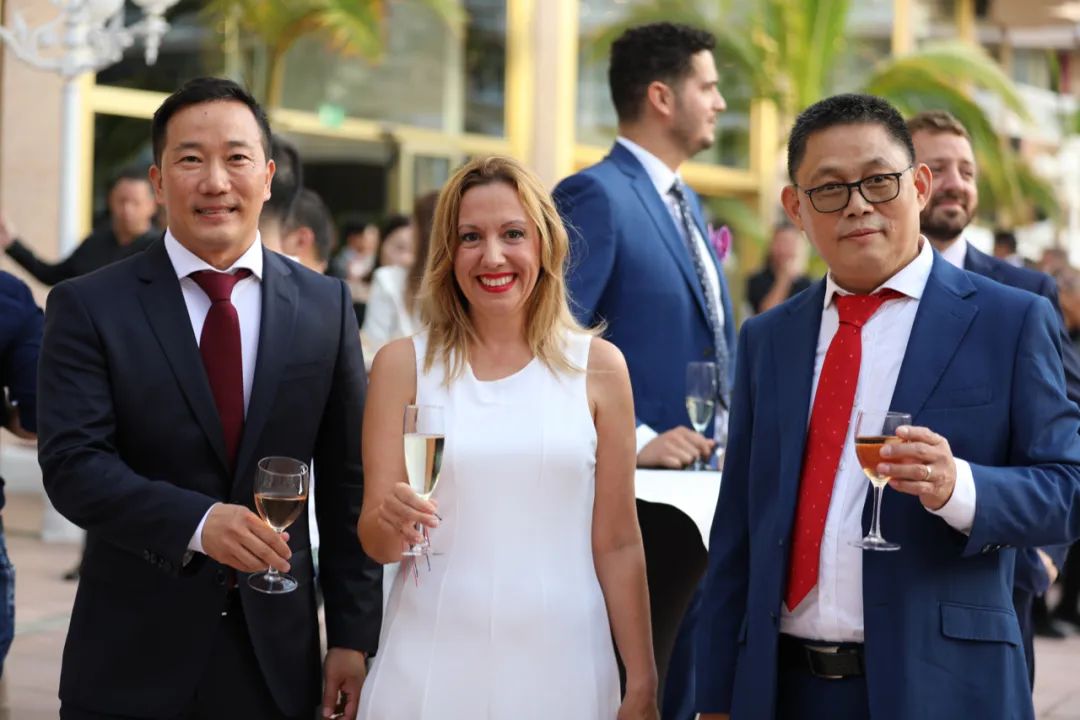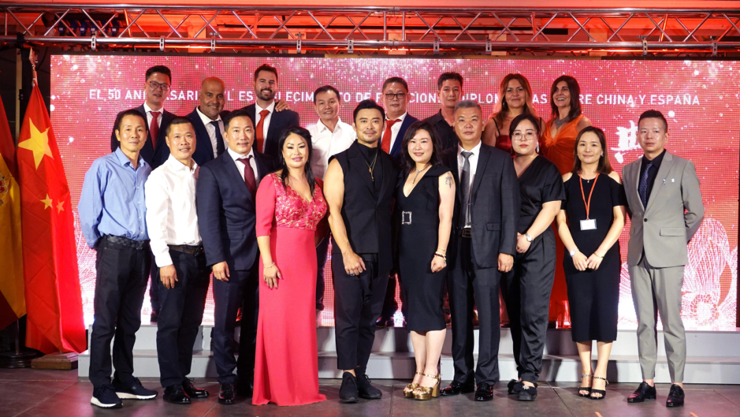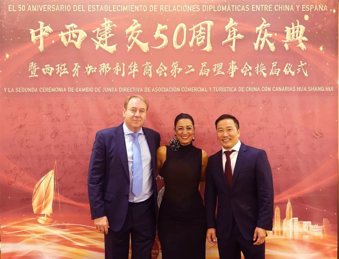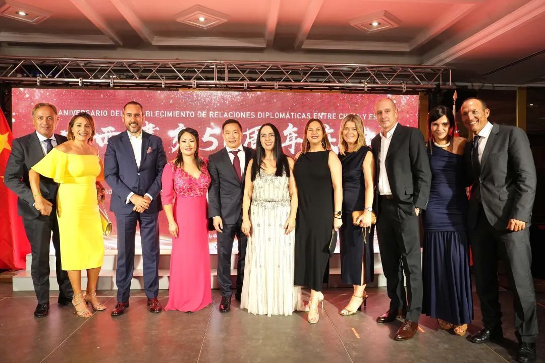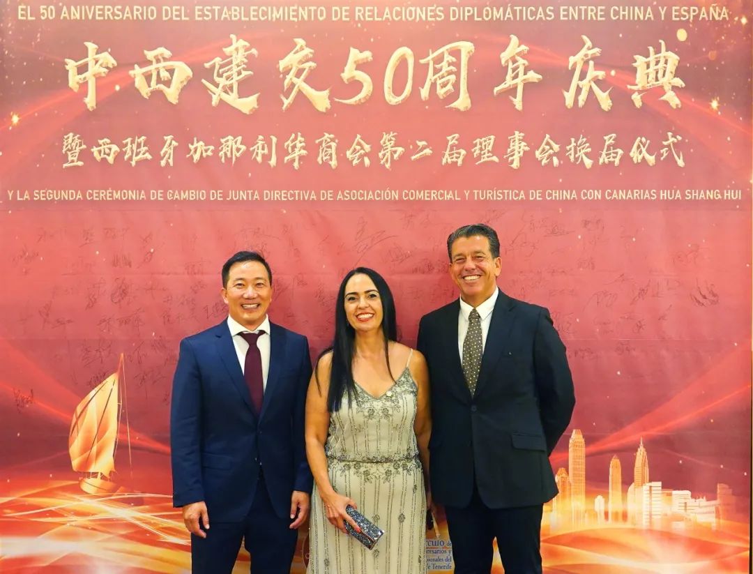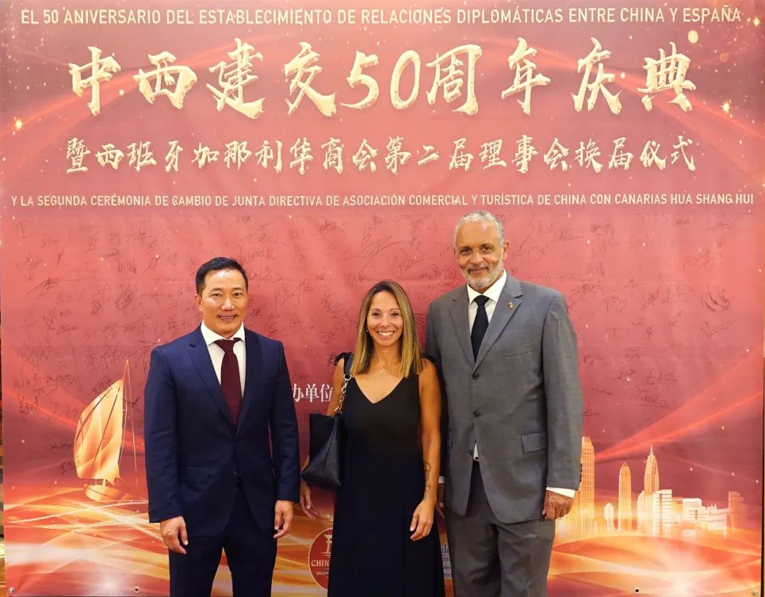 特内里费岛政府主席罗莎·达维拉(Rosa Dávila),阿罗纳市长法蒂玛·莱梅斯·雷韦隆(Fátima Lemes Reverón),加那利群岛国家警察局局长路易斯•费利佩•圣马丁(Luis Felipe San Martín),圣米格尔德亚沃纳市长阿图罗·冈萨雷斯·埃尔南德斯(Arturo González Hernández),圣克鲁斯•德特内里费省国民警卫队队长安赫尔·桑斯·科罗纳多(Ángel Sanz Coronado),西班牙军队伊格纳西奥·何塞·布代特·马林上校(Ignacio JoséBoudet Marín),法国驻西班牙领事伯纳德·洛尼斯(Bernard Lonis)及委内瑞拉、厄瓜多尔、危地马拉、洪都拉斯、葡萄牙、匈牙利等国家的驻西班牙领事,CEST商会主席弗朗西斯科·哈维尔·卡布雷拉·阿玛多(Francisco Javier Cabrera Amador),Grupo Número1集团总裁阿米德·阿奇·法杜尔(Amid Achi Fadul)等西班牙政商界人士,以及来自马德里、巴塞罗那、瓦伦西亚、马拉加等西班牙各地的华侨华人代表出席活动。近400名中西各界人士齐聚一堂,共同庆祝中西建交50周年,见证西班牙加那利华商会第二届理事会换届的重要时刻。