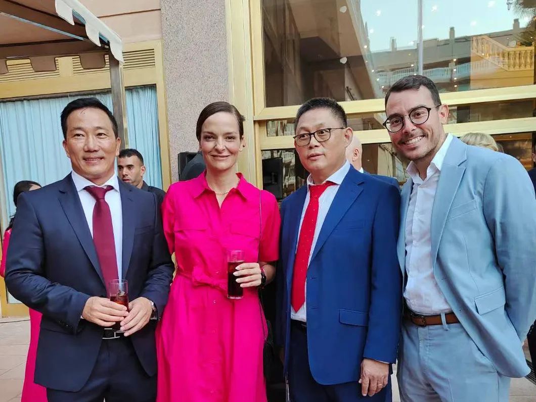 西班牙加那利华商会会长周长栓(左一)与法国驻西班牙领事伯纳德·洛尼斯(Bernard Lonis)夫妇在签名墙前合影留念。