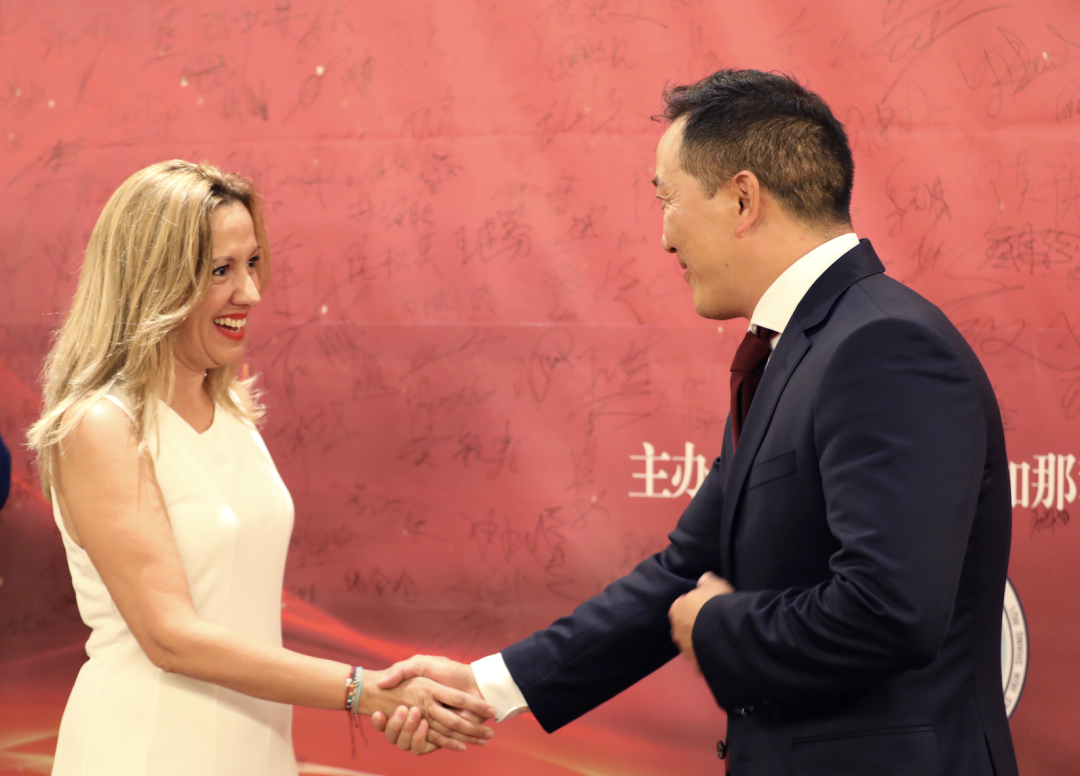特内里费岛政府主席罗莎·达维拉(左一)与西班牙加那利华商会会长周长栓在签名墙前握手。