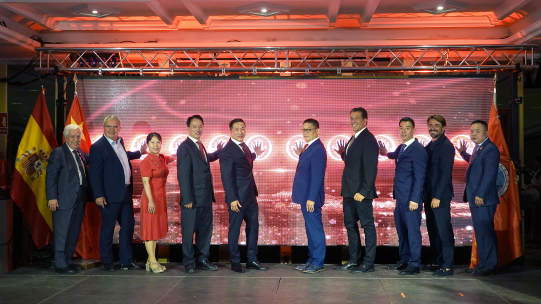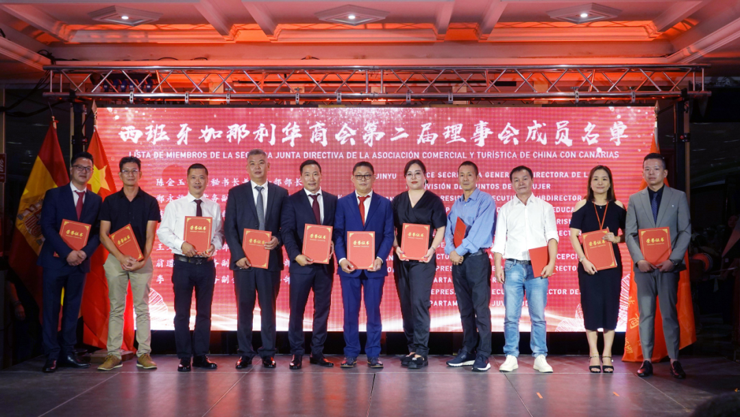 Grupo Número1集团总裁阿米德·阿奇·法杜尔(Amid Achi Fadul)、圣米格尔德亚沃纳市长冈萨雷斯、西班牙华侨华人妇女联合会会长王建芬、西班牙福建同乡会会长蒋铜官、西班牙加那利华商会会长周长栓、西班牙加那利华商会永久荣誉会长陈志彬、CEST商会主席卡布雷拉、加那利华人华侨协会会长李丽驱、西班牙酒店联合会主席豪尔赫·马里查尔(Jorge Marichal)、西班牙浙江总商会会长周志文上台参与西班牙加那利华商会第二届理事会换届启动仪式,与现场所有嘉宾共同见证西班牙加那利华商会第二届理事会诞生的重要时刻。