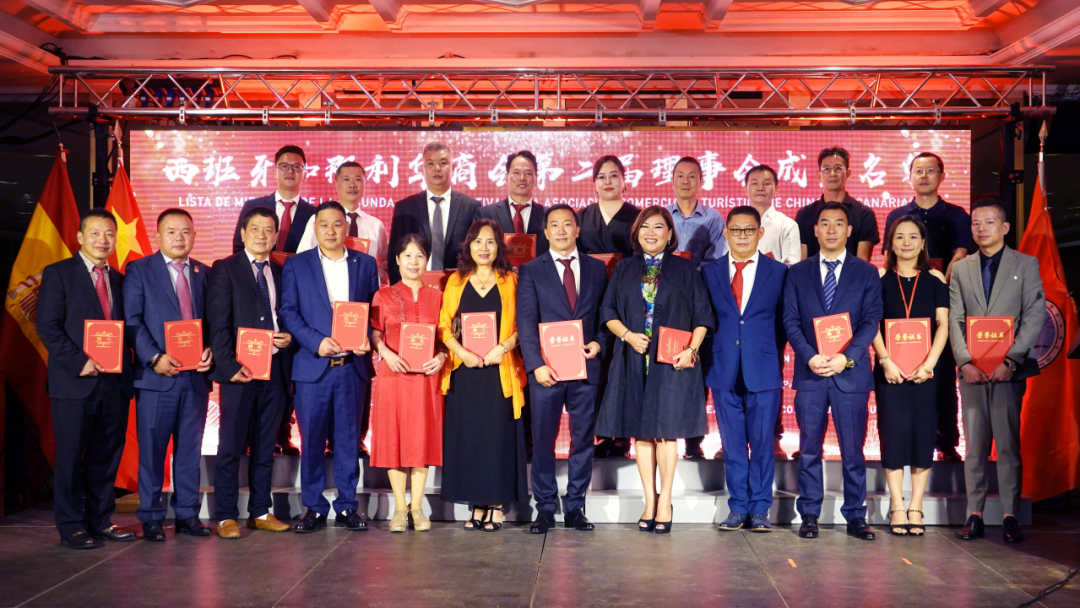 西班牙加那利华商会秘书长黄林烯宣读新一届理事会人员名单和第二届理事会名誉会长名单,西班牙加那利华商会会长周长栓为西班牙加那利华商会第二届理事会成员以及名誉会长颁发证书。
