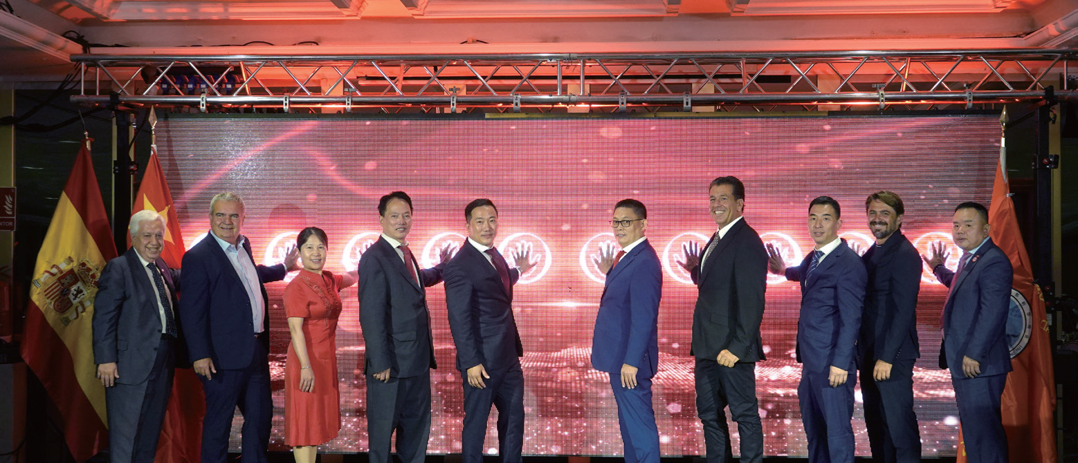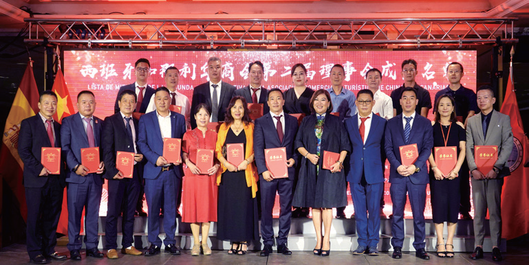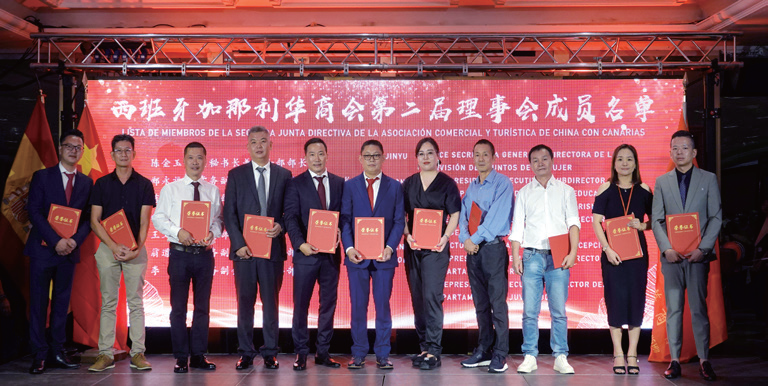Grupo Número 1集团总裁阿米德·阿奇·法杜尔、圣米格尔德亚沃纳市长冈萨雷斯、西班牙华侨华人妇女联合会会长王建芬、西班牙福建同乡会会长蒋铜官、西班牙加那利华商会会长周长栓、西班牙加那利华商会永久荣誉会长陈志彬、CEST商会主席卡布雷拉、加那利华人华侨协会会长李丽驱、西班牙酒店联合会主席豪尔赫·马里查尔、西班牙浙江总商会会长周志文上台参与西班牙加那利华商会第二届理事会换届启动仪式,与现场所有嘉宾共同见证西班牙加那利华商会第二届理事会诞生的重要时刻。