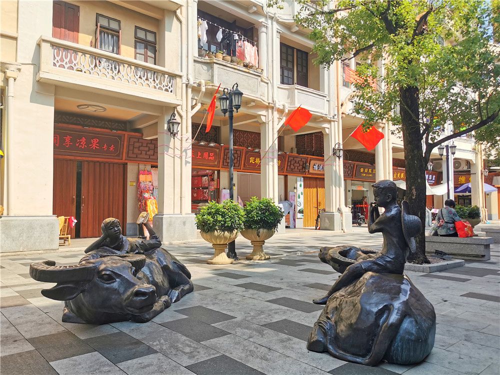 始建于清光绪八年(1882年)的台山市台城西宁市历史文化街区,每逢节假日游人如织。其中一段叫革新路,又称“牛屎巷”,中间空旷处设有两具小孩或趴或坐在水牛身上的铜像,看似与附近的历史骑楼建筑不搭,实则与此地曾是贩牛的圩集有关。