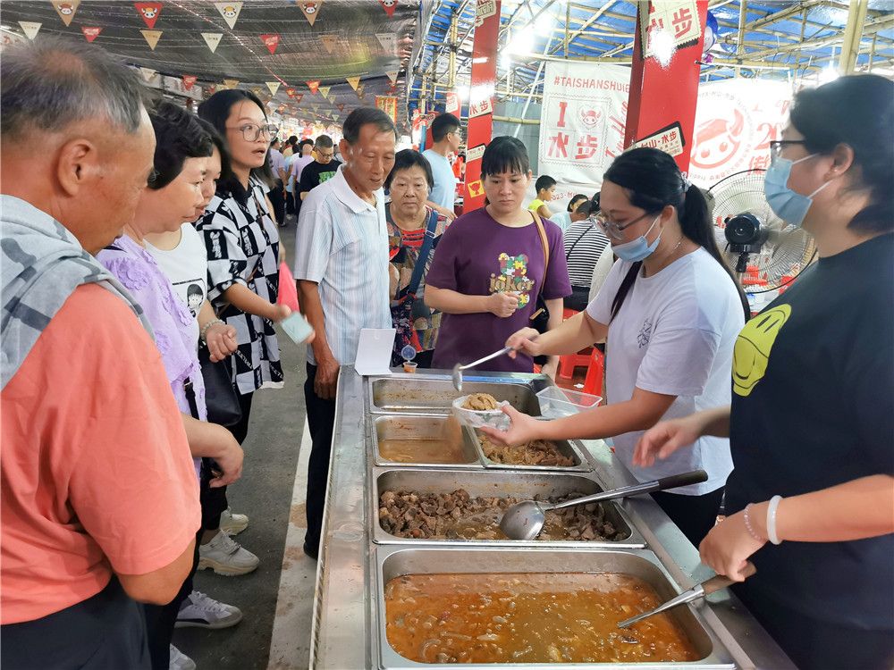10月14日,广东台山水步镇山口圩牛肉节今年多了些卖熟牛杂的档口,吸引不少游客驻足购买和品尝。(图片来源:中新社)