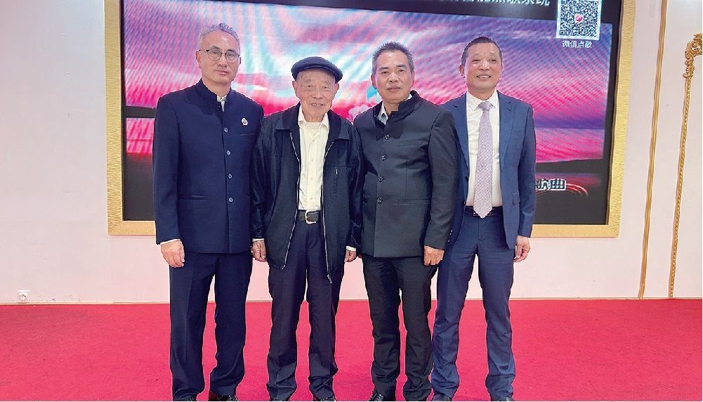 孙少荣(右2)请父亲孙炎欣(右3)上台,深情献歌一首《父亲》。左1为周伟,右1为卓旭光。