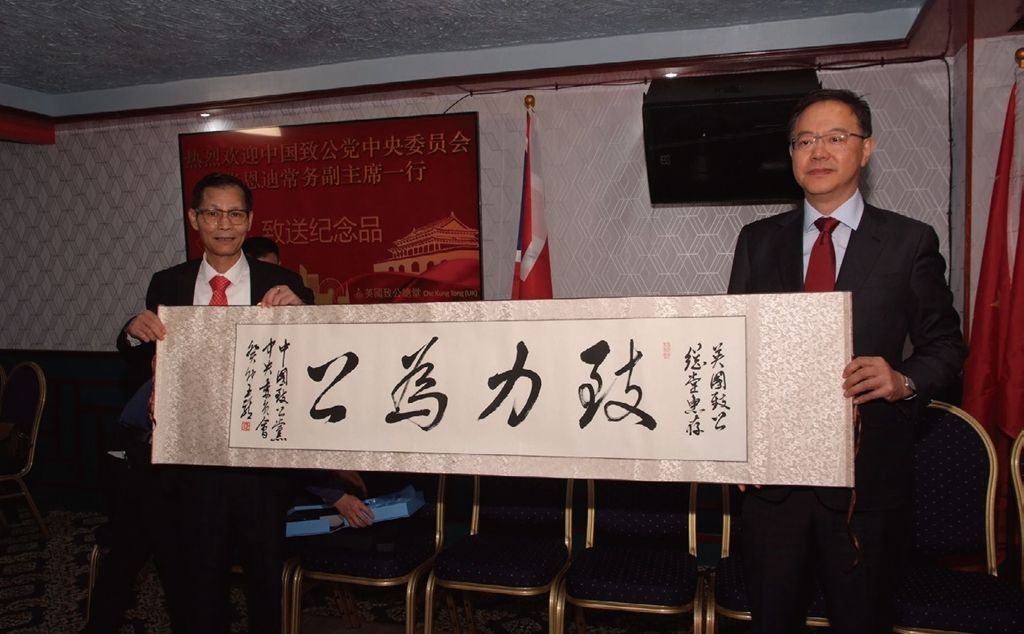 欢迎晚宴设在致公总堂旁边的万泉河大酒楼,张迪恩常务副主席在晚宴前耐心解答了一些侨界代表感兴趣的问题,在被问及中国致公党会今后是否会与利物浦致公总堂有更多的互动时,张恩迪表示代表团访问致公堂的目的之一就是要了解中国致公党今后如何与海外致公堂开展更多的联谊活动,从而增强海外华侨华人对祖籍国的了解和促进中英民间人文交流。同时,张恩迪还高度赞扬了利物浦致公总堂一百多年来坚持发扬“致力为公”精神,为团结当地华人华侨、带领华人社区互帮互助等方面不懈努力。