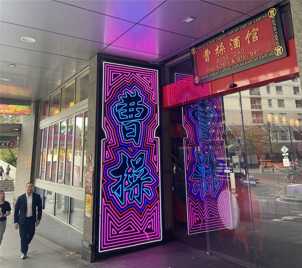 同样位于唐人街的“曹操酒馆”,则以其火辣的川菜吸引不少年轻人来品尝。站在店门口就很难不被霓虹灯拼成的“曹操”两个大字吸引。走上楼梯,能看到更多国潮元素,麻将、大鼓、刻着吉祥话的红黑色牌匾等。