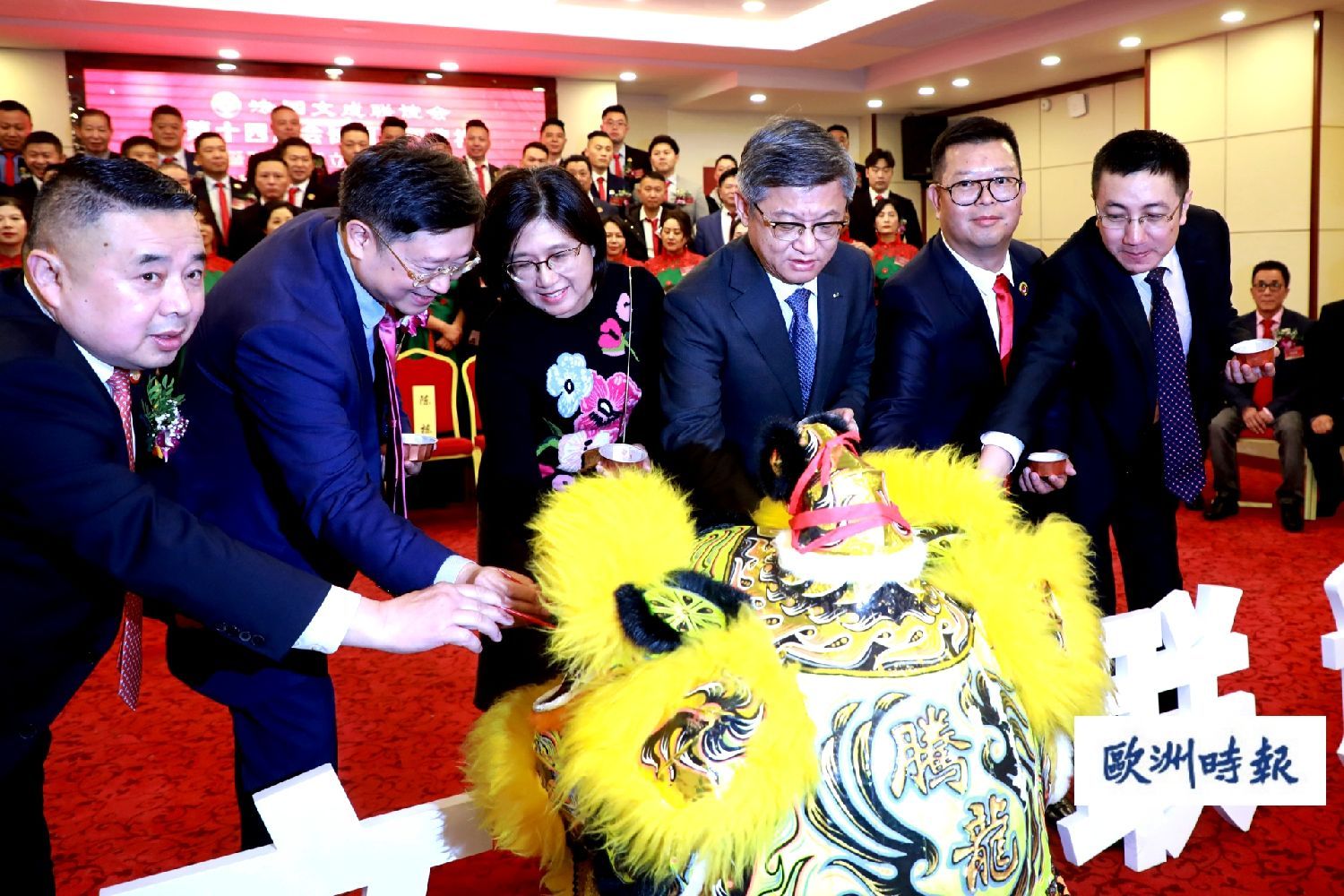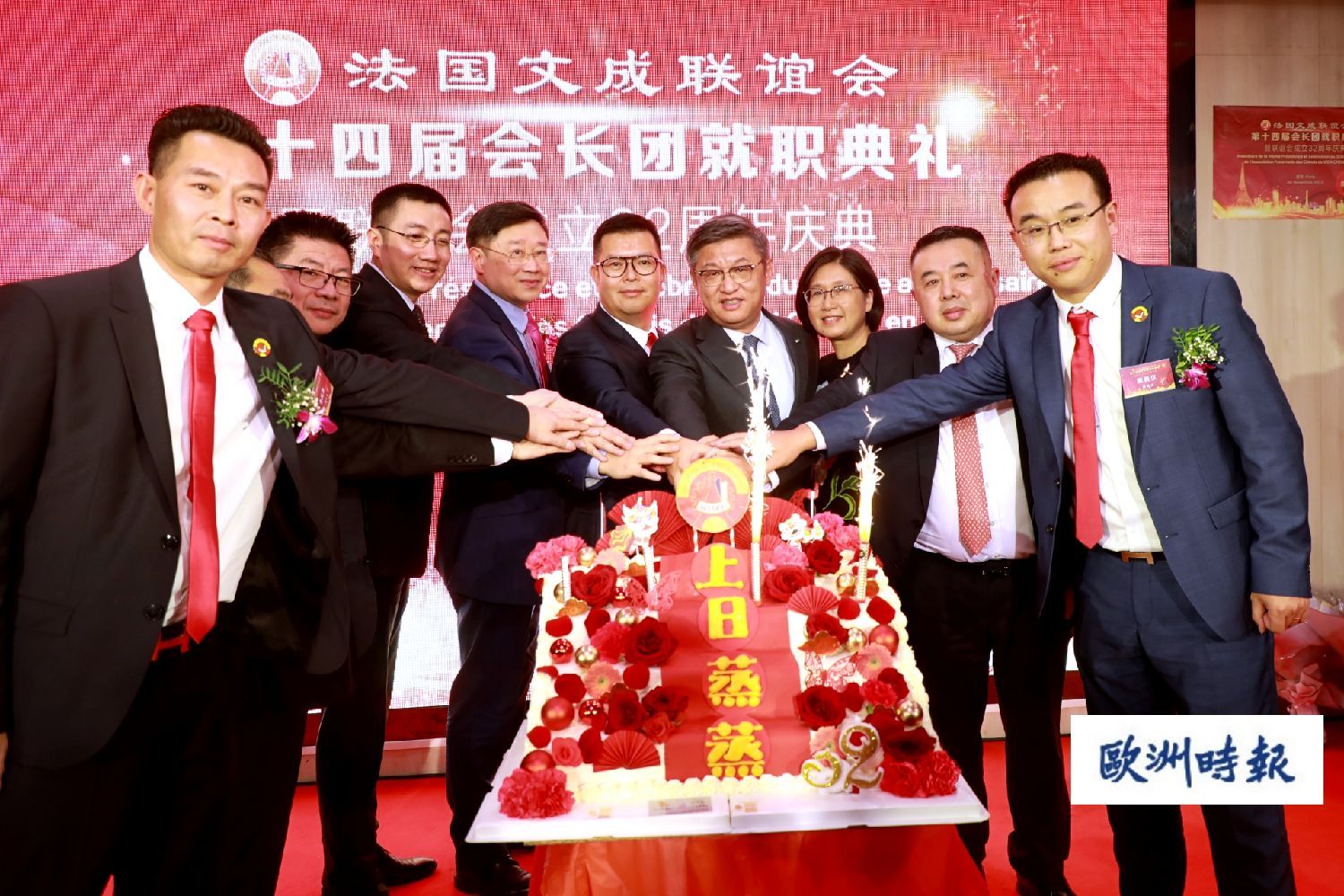 当晚就职典礼上,陈栋和夫人林文华、万磊、蔡君柱、朱良顺、刘小慧和法国文成联谊会名誉会长胡文华、朱少云、第一副会长朱凤海、秘书长张美汉为法国文成联谊会成立32周年切下生日蛋糕。