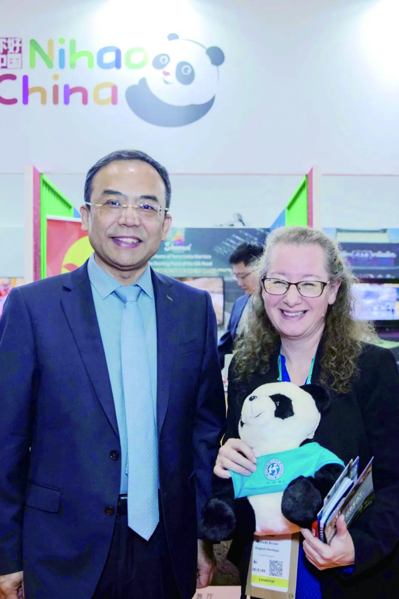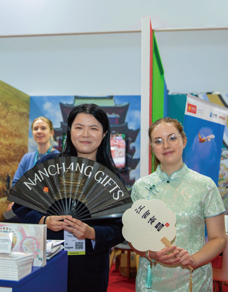 江西参展方(左)与英国中国文化旅游推广大使安启月合影。(图片来源:朱若溪 摄)