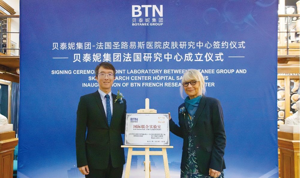 法国圣路易斯医院皮肤研究中心炎症性皮肤及免疫团队负责人米歇尔教授(右)与贝泰妮集团副总裁、贝泰妮研究院执行院长王飞飞为国际联合实验室揭牌。