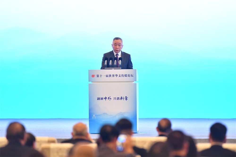 10月23日,由国务院侨务办公室、四川省人民政府和中国新闻社主办的第十一届世界华文传媒论坛在成都开幕。本届论坛以“融通中外,共谱新章”为主题,来自五大洲59个国家和地区的近300家华文媒体代表人士参加论坛。图为法国《欧洲时报》社长钟诚在开幕式上发言。(图片来源:本文图片均自中新社)