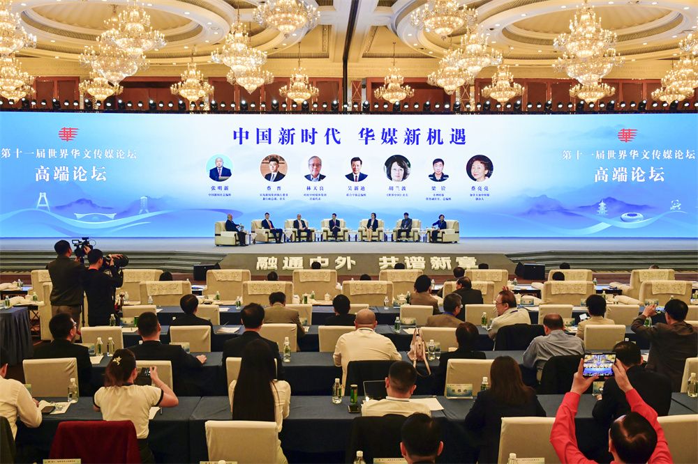 10月23日,由国务院侨务办公室、四川省人民政府和中国新闻社主办的第十一届世界华文传媒论坛在成都开幕。本届论坛以“融通中外,共谱新章”为主题,来自五大洲59个国家和地区的近300家华文媒体代表人士参加论坛。图为高端论坛现场。