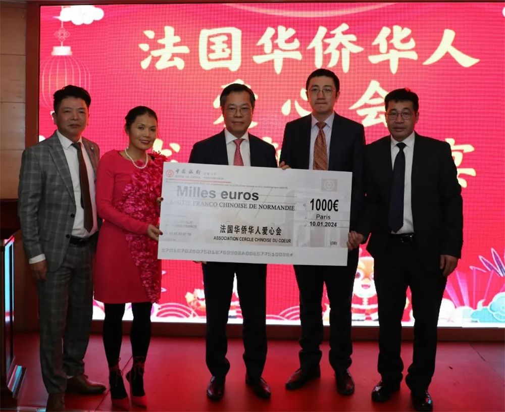 受邀参加晚会的法国诺曼底法中友好协会会长萧遐向大家讲述了自己在诺曼底小镇库唐斯坚持弘扬中华文化的故事,从2019年开始,每两年她牵头在法国诺曼底大区拉芒什省库塘斯市(Coutances)举行一次“中国风”中国文化节,通过展览、电影、书法、讲座、茶道、彩妆游行等形式,向当地民众展示中国文化的魅力,深受当地民众的欢迎。为对其弘扬中国文化的行动的支持,爱心会决定向诺曼底法中友好协会捐款1000欧元。洪震波表示,弘扬中华文化是我们共同的责任,需要大家的共同努力。