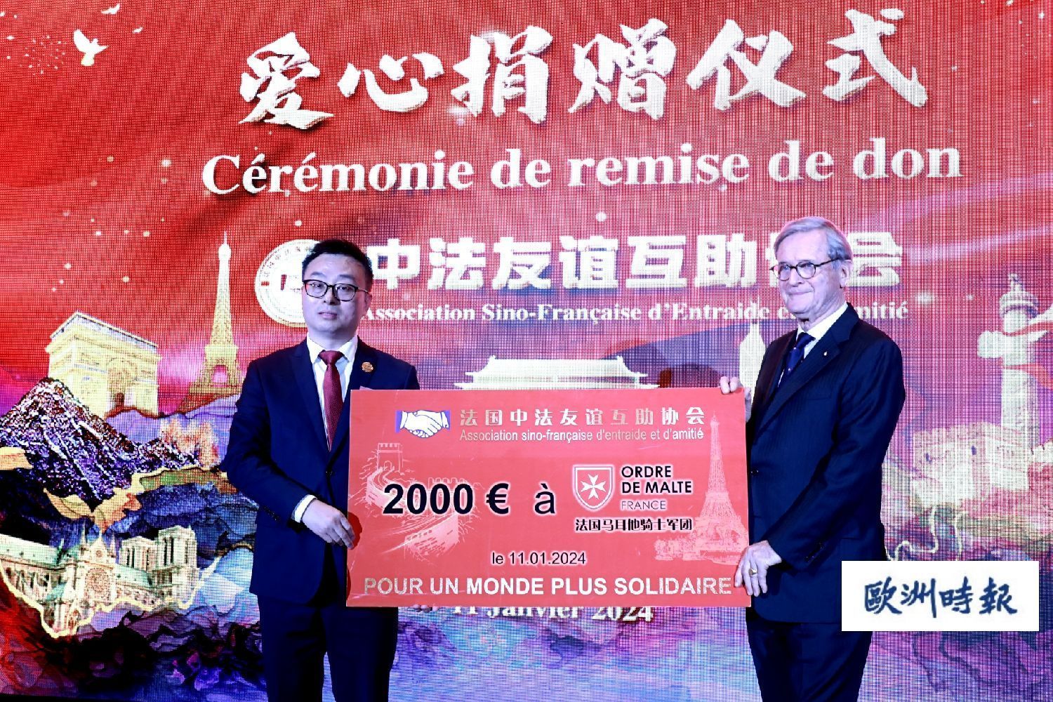 何建兴代表法国中法友谊互助协会向马耳他骑士法国军团捐赠了2000欧元,并与中国驻法使馆领事侨务处万磊参赞、法国团结进步党创始人Jacques CHEMINADE、法国中法友谊互助协会第九届会长姜学峰、法国中法友谊互助协会青年委员会主任张伟良一起启动了法国中法友谊互助协会“友谊助学奖教金"项目计划。