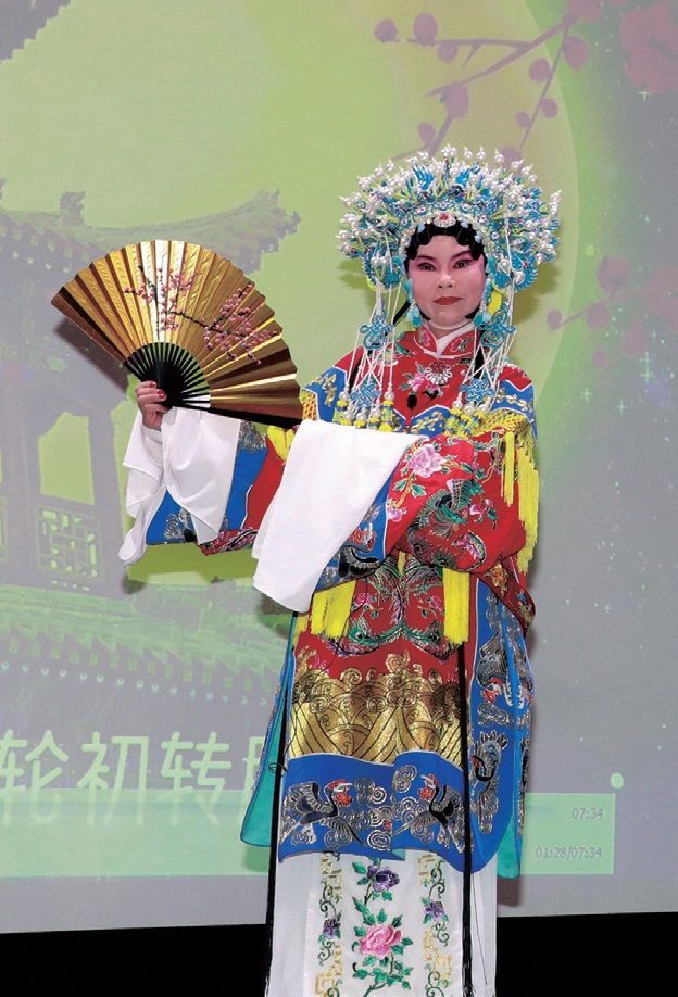 巴黎知名青衣票友胡越乔盛装华服演唱《贵妃醉酒》中的“四平调”。本文图片均由孔帆摄