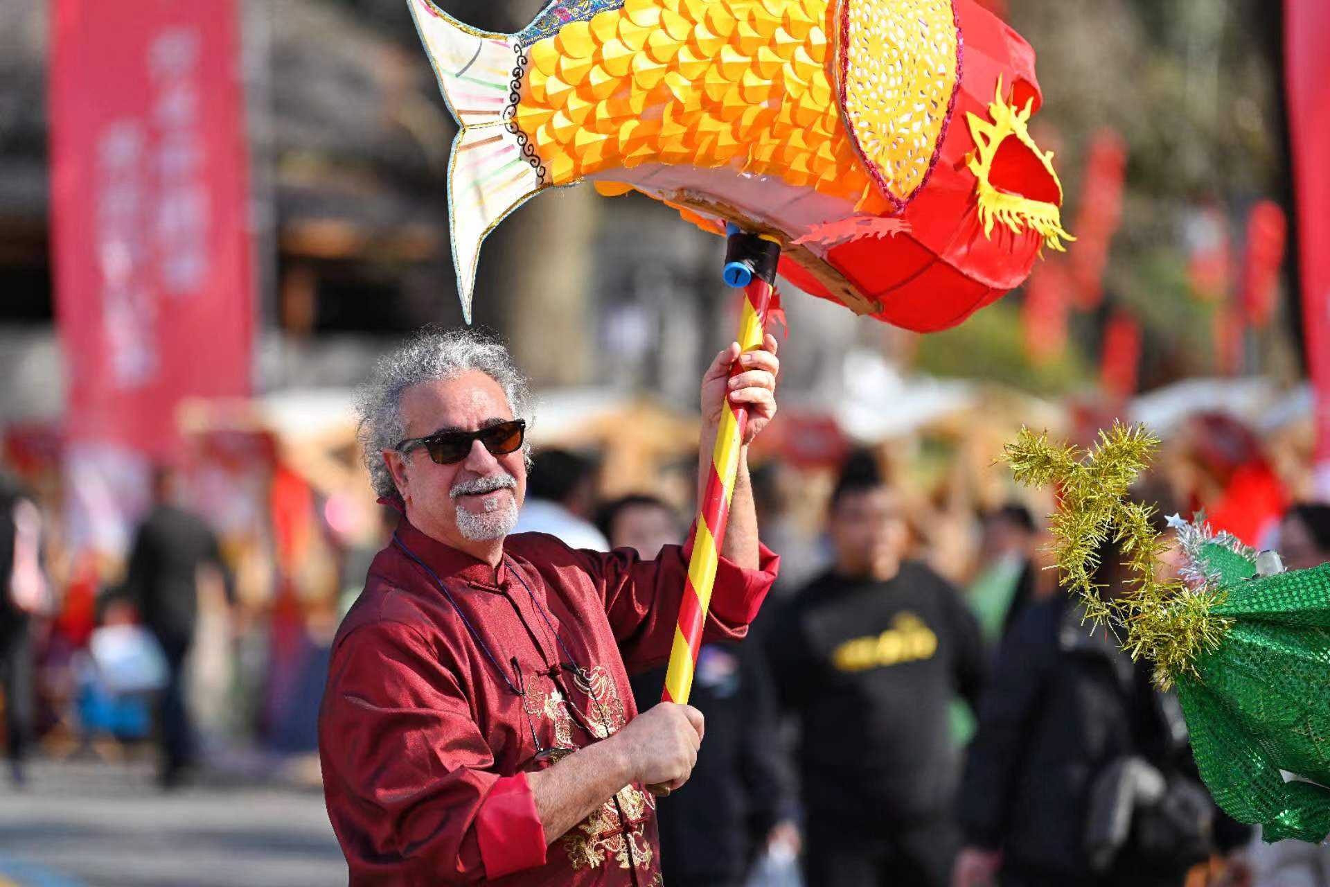 2月3日,浙江丽水青田,国际友人挥舞鱼灯。(图片来源:中新社)