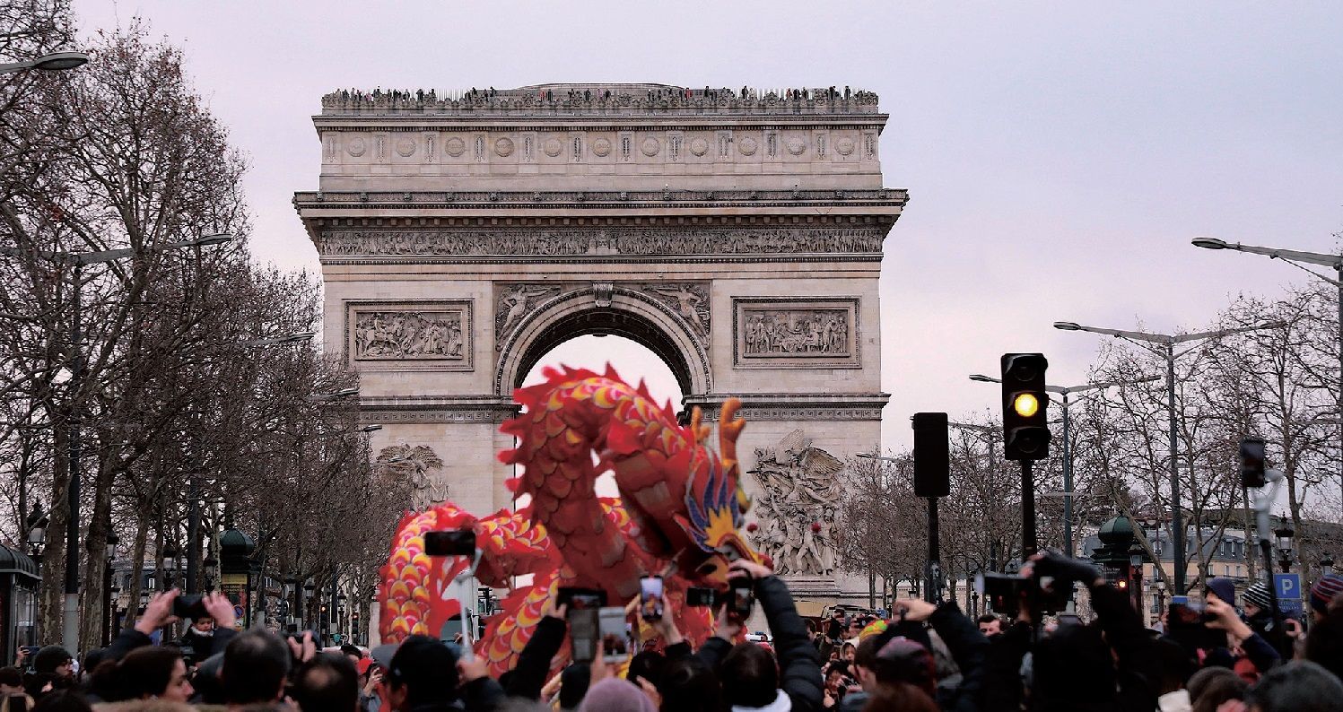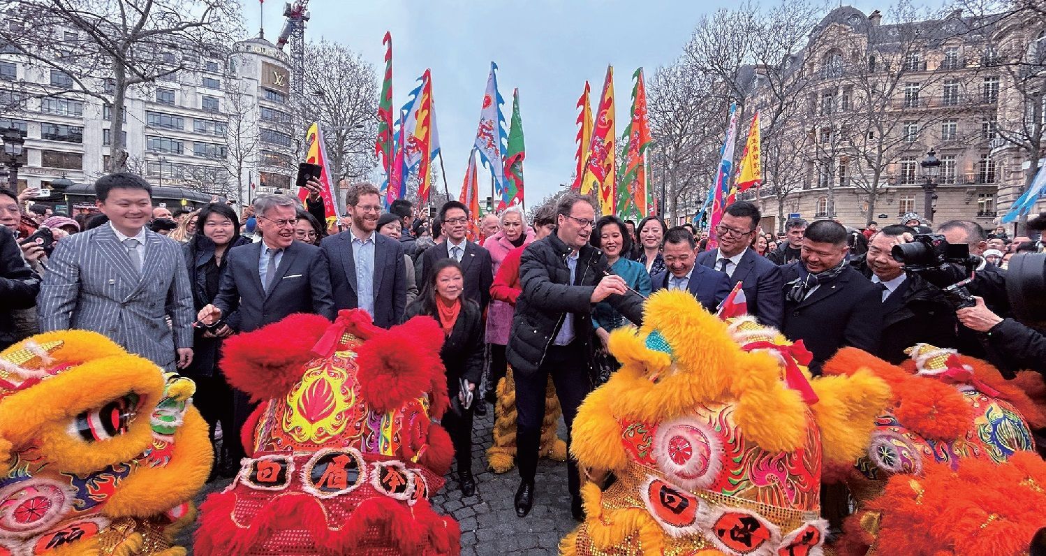 【欧洲时报记者孔帆巴黎报道】醒狮、舞龙、汉服、青田鱼灯、东北大花袄,华人春节游行队伍让宽阔的香榭丽舍大街顿时变得拥挤。2月4日下午3时,由法国法华工商联合会、法国文成联谊会、法国浙江商会、法国外籍兵团退伍华人协会、法国华人服装业总商会联合主办,法国巴赫瑞集团(Barrière)协办,泊睿公司承办,中国驻巴黎旅游办事处为特别支持单位的“龙狮贺岁舞香街”活动正式在世界最美大道启动。据组织方统计,当天超过5万人聚集香街。