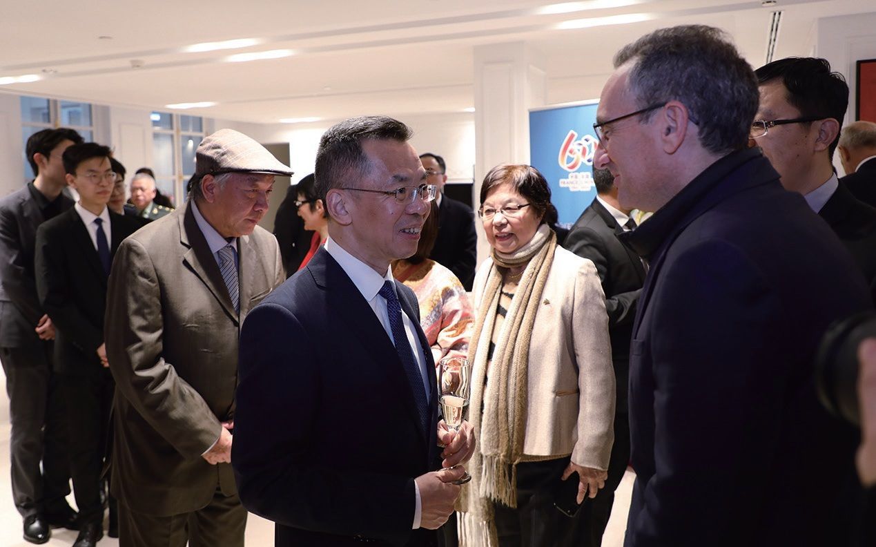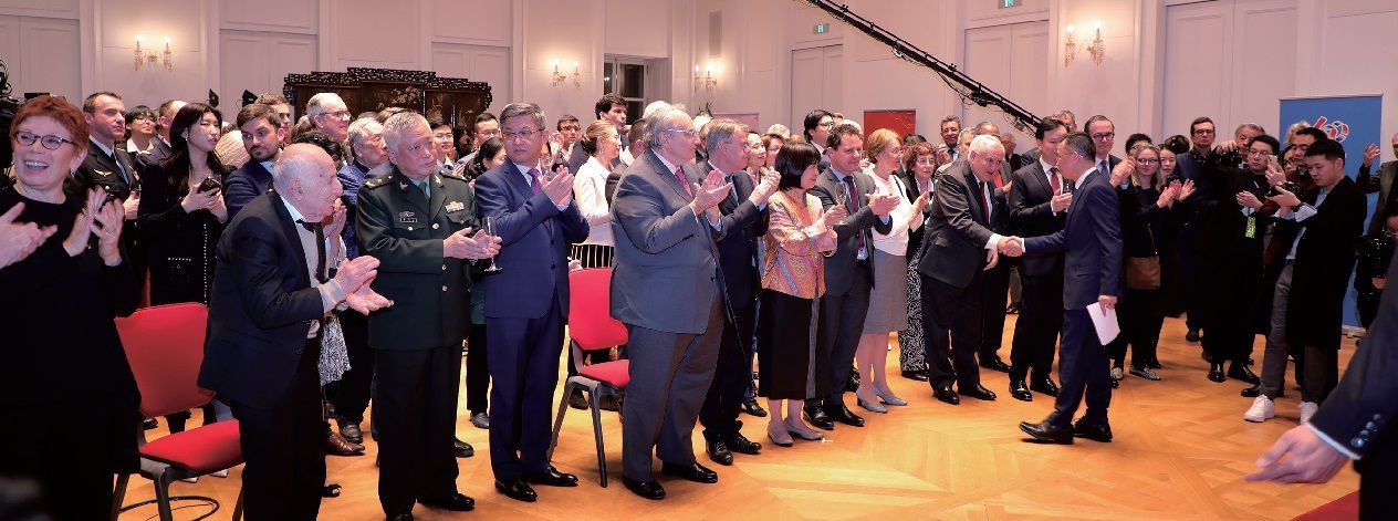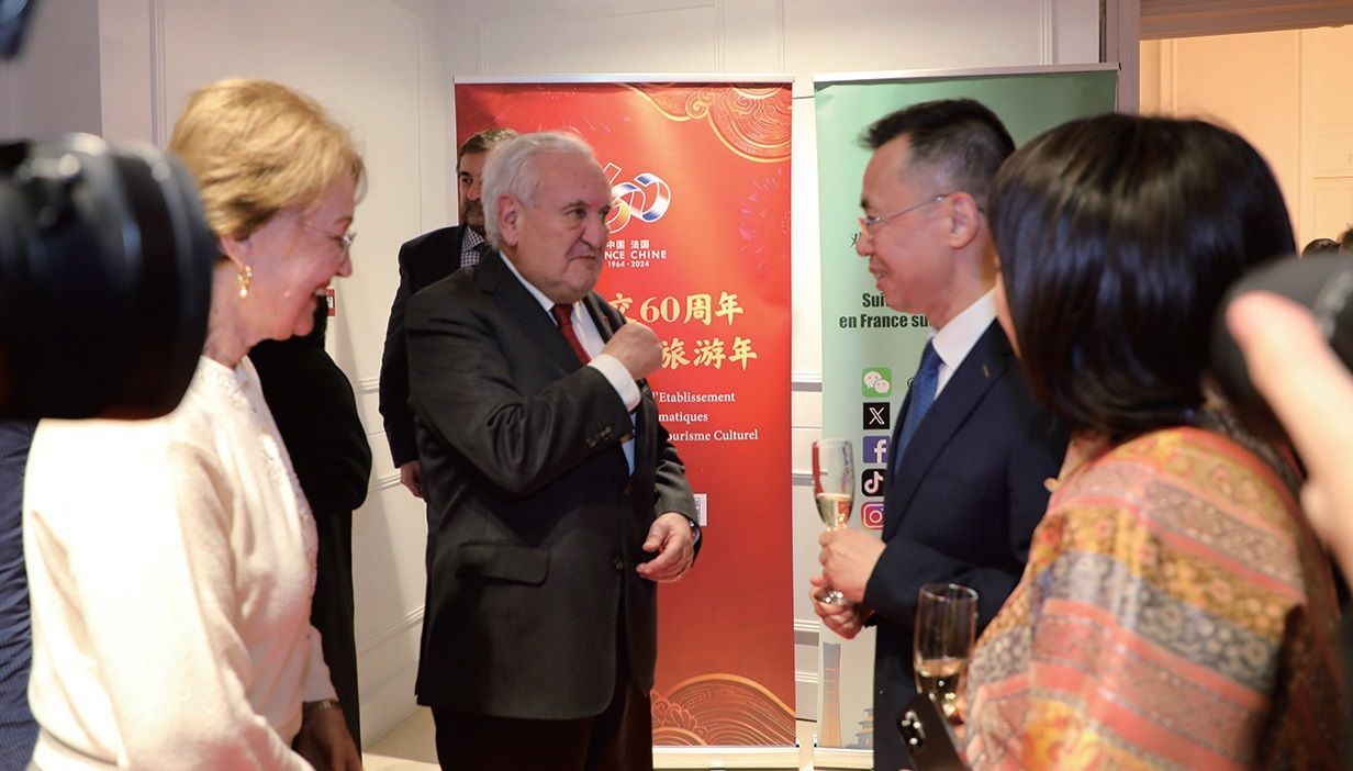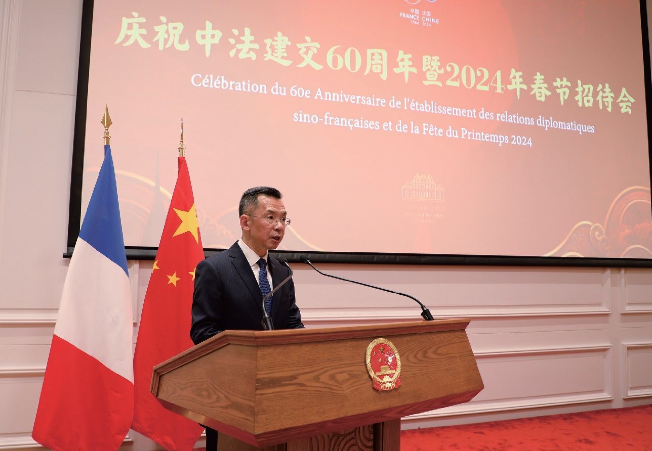 【欧洲时报记者黄冠杰巴黎报道】2月6日晚,中国驻法使馆院内,铺上了红地毯。多功能厅内,安放了特别设计的由红、蓝做底色,有中法建交60年标识、上用中法文标注的中法建交60周年暨中法文化旅游年标牌,还有喜庆的动漫龙。来自法国政界、文化、科技、教育、军事等领域的嘉宾喜气洋洋,相互祝福,一派欢乐的祥和气氛。这是中国驻法使馆举办的庆祝中法建交60周年暨龙年春节招待会。