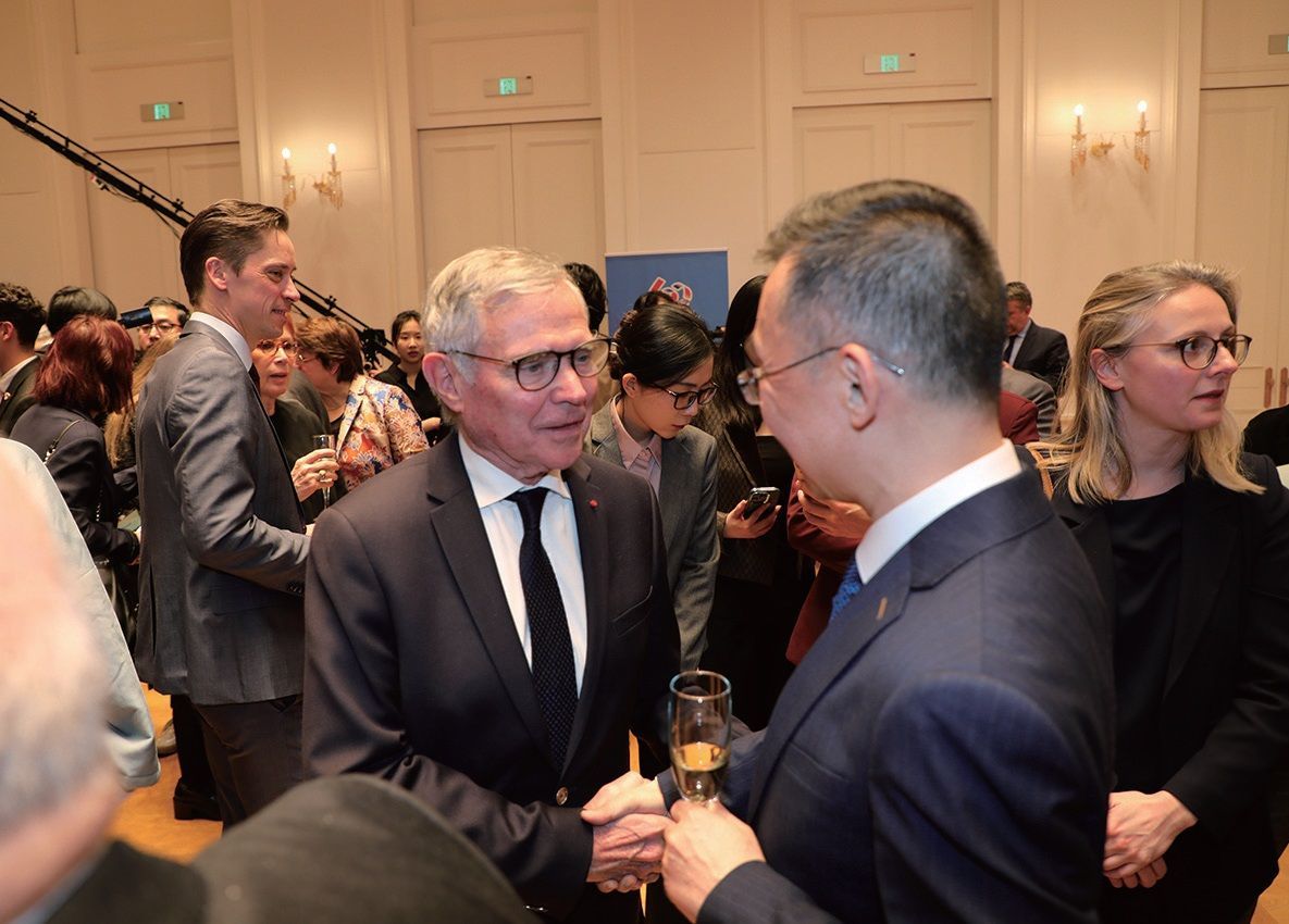 现场记者看到,卢沙野大使和夫人,陈栋公使和夫人、陈力公使、李鸿飞武官等使馆外交人员热情和来宾打着招呼,与来自不同领域的人员亲切交谈。法国前总理拉法兰和夫人、法国参议院副议长洛伊克·埃尔韦(Loïc Hervé)、法国国民议会法中友好小组主席埃里克·阿洛泽(Eric Alauzet)、法国参议院法中小组主席热罗姆·杜兰(Jérôme Durain)、法国欧洲和外交部全球化、文化、教育和国际发展总司总司长奥雷利安·勒舍瓦利耶(Aurélien Lechevallier)、法国国民议会前议长阿夸耶(Bernard Accoyer)等嘉宾纷纷和卢沙野大使握手致意,向大使表示祝贺,并热情回忆起和中国的缘分和交往,祝愿中国龙年大发展,祝福法中友谊长存。