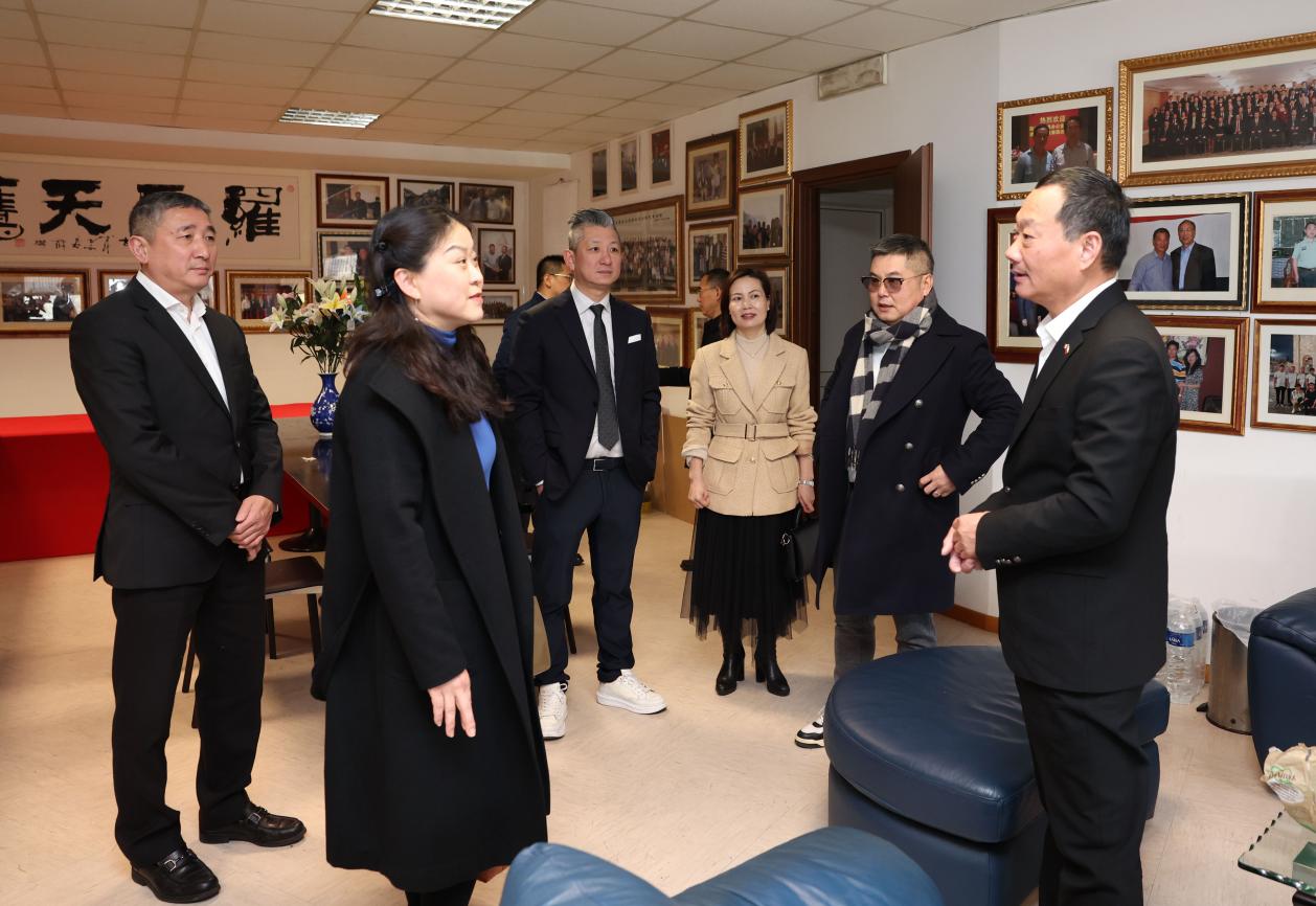 罗马天鹰仓储物流有限公司董事长、罗马华侨华人联合总会理事长林美银(右一)向过琳公参(左二)做介绍。(图片来源:欧洲时报记者张锐摄)