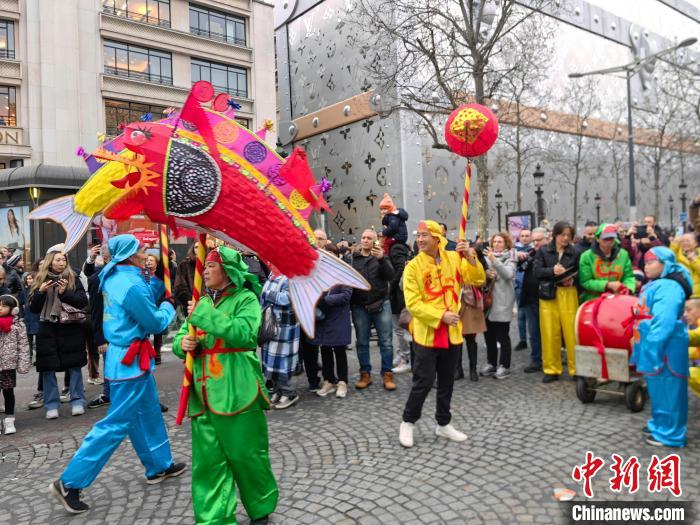浙江丽水青田县委统战部8日透露,临近龙年春节,国家级非物质文化遗产青田鱼灯“游”上法国巴黎香榭丽舍大街,向当地民众送上新春祝福。