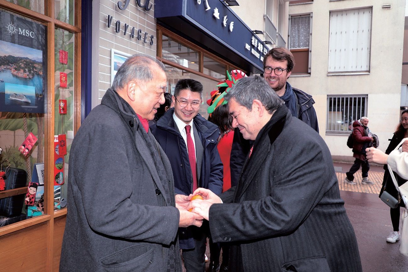 【欧洲时报记者黄冠杰巴黎报道】2月10日是龙年春节。一大早,按照中国传统文化习俗,巴黎13区区长顾梅(Jérôme Coumet),巴黎市长代表、副市长吉尤(Antoine Guillou)以及巴黎13区华人议员陈家辉(Daniel Tran)等区政府成员冒着细雨,按照传统走访巴黎13区的主要华人社团,依次走访了法国福建会馆、巴黎13区商家联合会、法国华裔互助会和法国潮州会馆等,向大家介绍巴黎13区的发展成就,感谢大家过去一年对巴黎13区的发展和法中友谊所做的贡献,向13区居民祝福春节,鼓励大家借助中法建交60周年、中法文化旅游年和巴黎奥运年的春风,继续为法中友谊做出贡献。巴黎13区一艺术学校的学生在巴黎13区政府的鼓励下,还特别制作了龙年贺年动画小视频,介绍了春节习俗,巴黎13区庆龙年的活动,在社交媒体上广泛播放,体现巴黎13区的中华文化特色,向大家拜年。