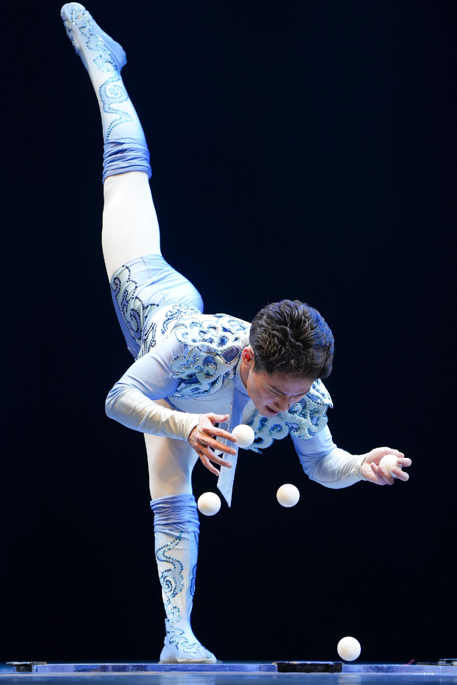 图为演员管利寅在英国伦敦举行的“四海同春”慰侨访演活动上表演杂技。(图片来源:新华社)