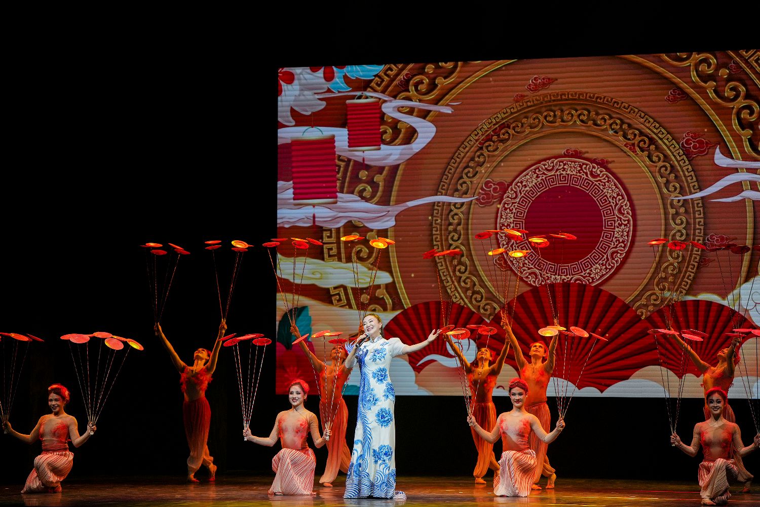 图为演员吴春燕(中)在英国伦敦举行的“四海同春”慰侨访演活动上表演独唱。(图片来源:新华社)