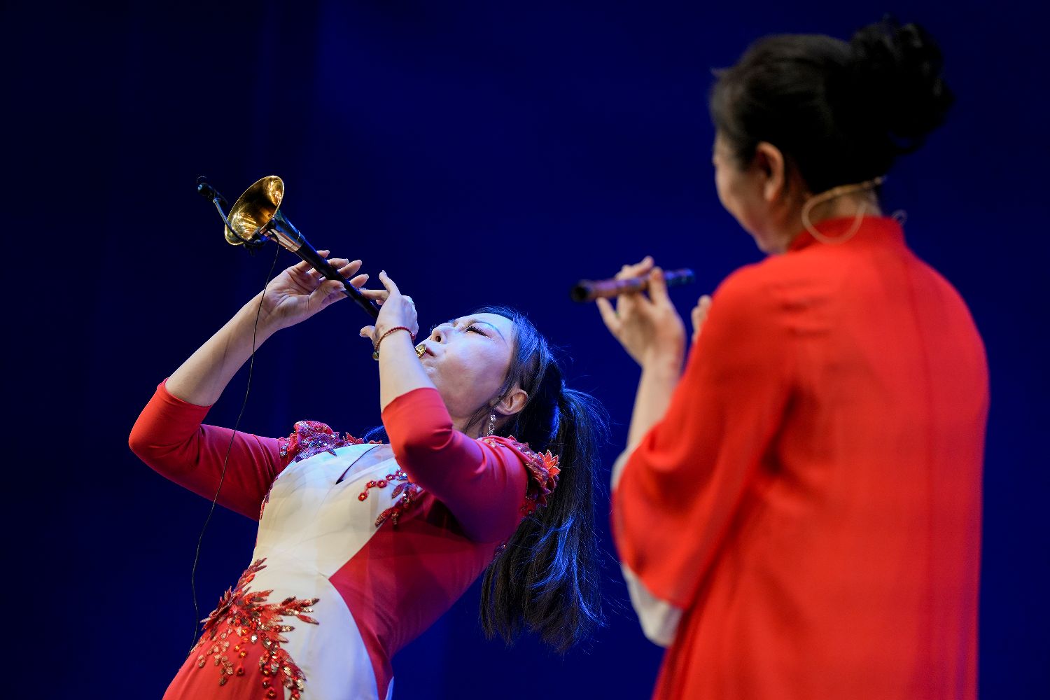 图为演员张钦静(左)和宁英杰在英国伦敦举行的“四海同春”慰侨访演活动上表演民乐合奏。(图片来源:新华社)