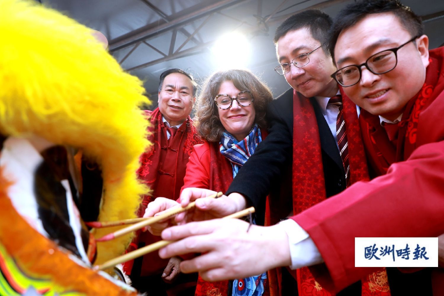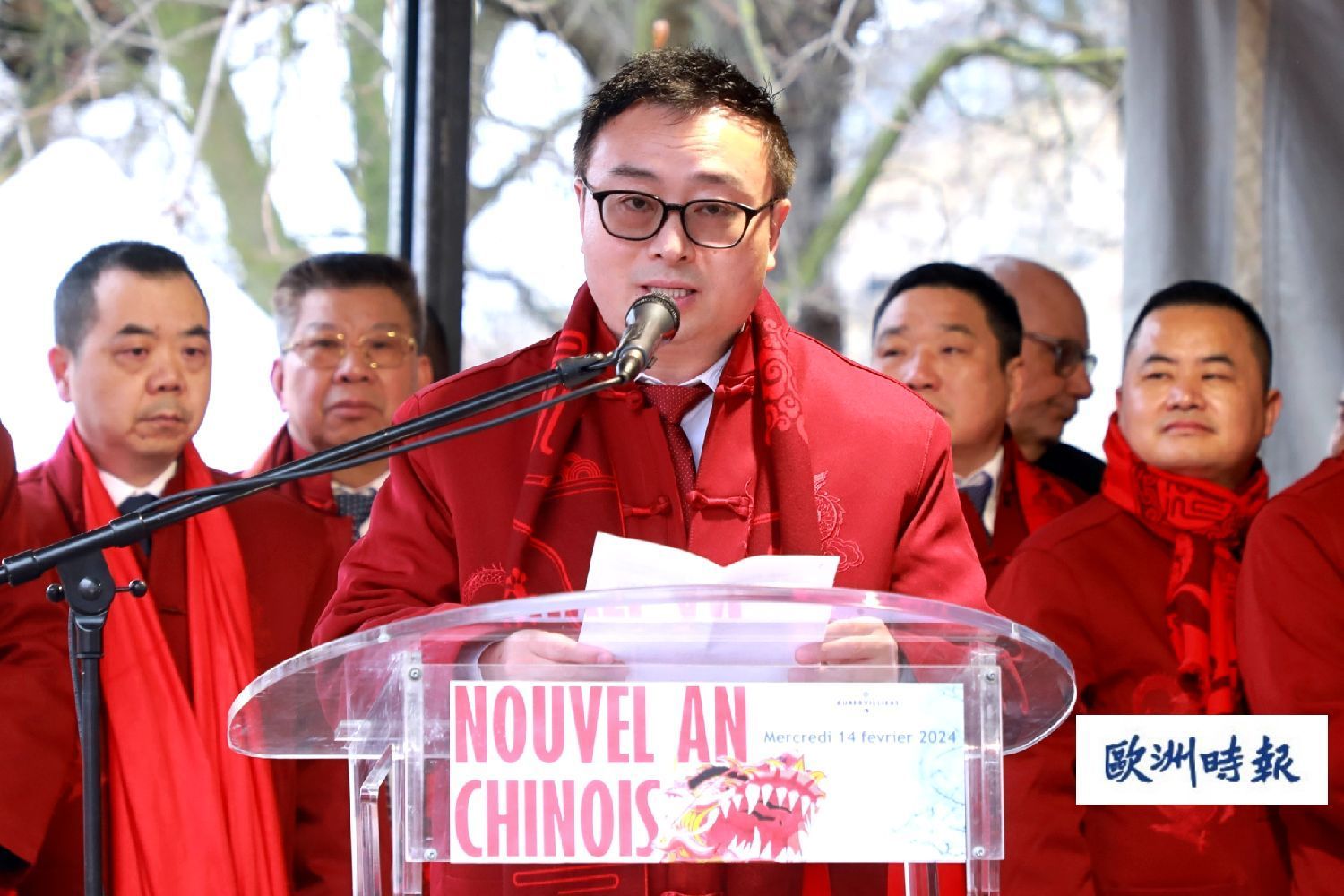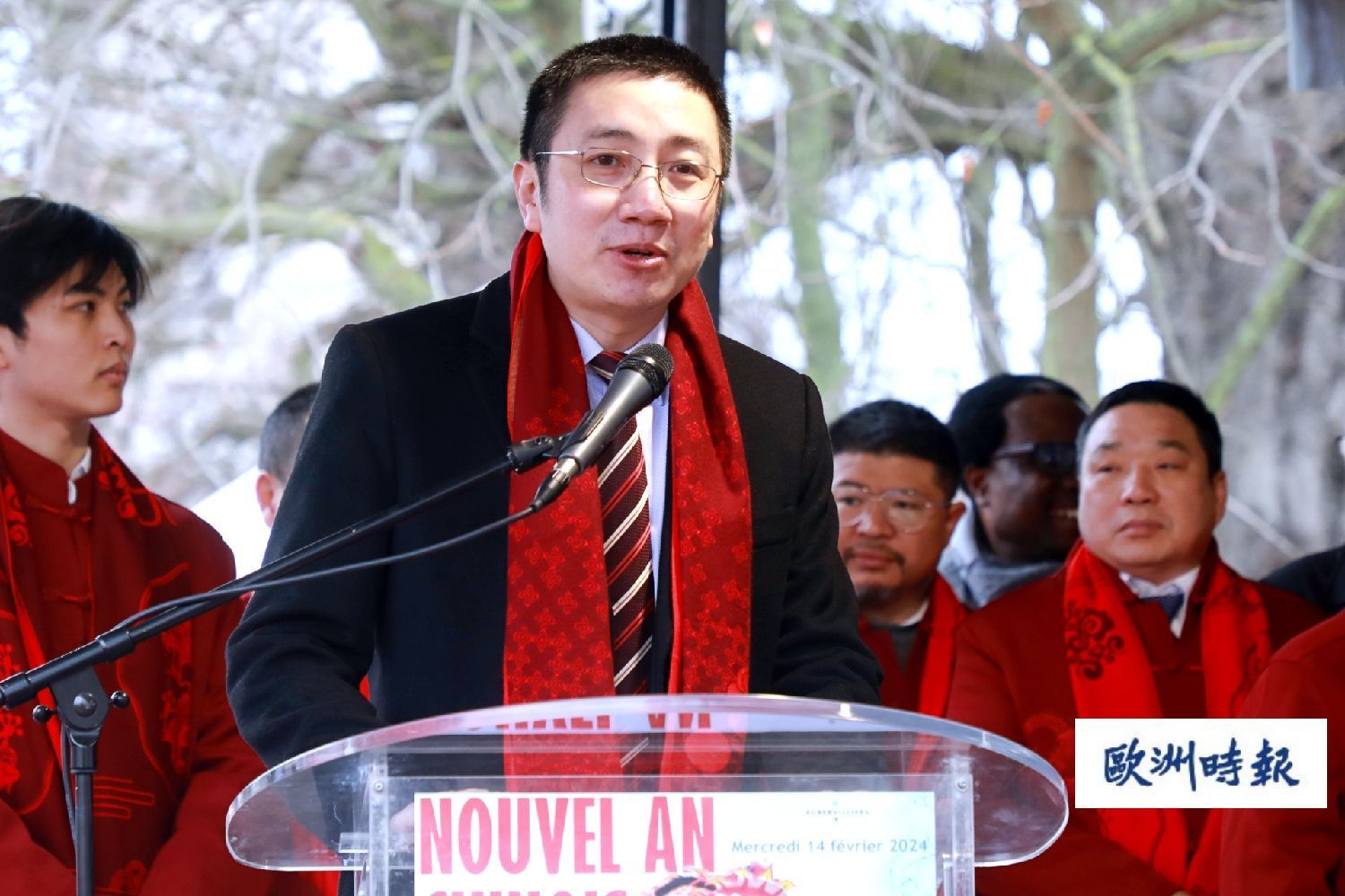 中国驻法使馆领事侨务参赞万磊向欧市当地民众介绍说,春节在中国是一个最重要的传统佳节,大年初五又是迎财神的好日子,祝大家财源滚滚,好运连连。同时祝大家在甲辰龙年里,龙行大运,身体健康、万事如意、家庭幸福。