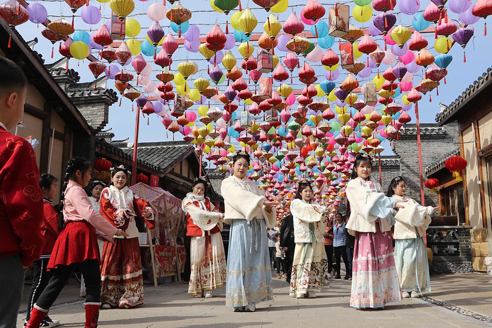 春节假期,六家畈开展国风快闪活动,身着汉服的姑娘们跳起时下爆火的“科目三”。(图片来源:中新社)