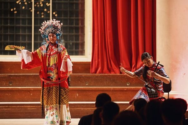 一直坚持在海外传播京剧文化的梅派?衣学习者郭映彤与中英戏曲协会会长邱增慧老师一起带来了京剧表演《梨花颂》,这首表现唐明皇和杨贵妃爱情的音乐也打动了在场的听众。师徒二人身穿“龙凤呈祥”表演服装,将美好的祝愿融合在喜庆的红色之中。邱老师说,京剧、二胡、唱念做打等表演形式在西方国家很受欢迎,“就像中国人需要时间接受歌剧一样,只要有足够的介绍、字幕讲解,语言和文化的壁垒都可以被打破。”