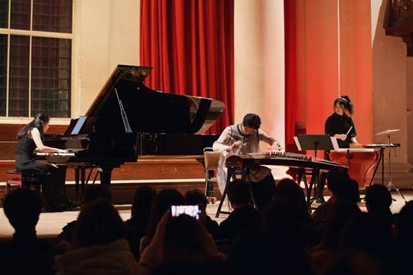 高难度古筝表演《苍歌引》轰动全场,琴弦在熟练的指尖下轻拨如同春风拂过柳枝般轻灵,激昂时音符如同急雨落地砸出涟漪,旋律时而悠扬婉转,时而大气磅礴。这是《苍歌引》第一次在欧洲演出,青年古筝演奏家杨康坦言自己“很紧张”,“我一直在英国传播中国音乐文化,我们去了很多教堂和学校表演,很荣幸能在东风音乐会上表演。”