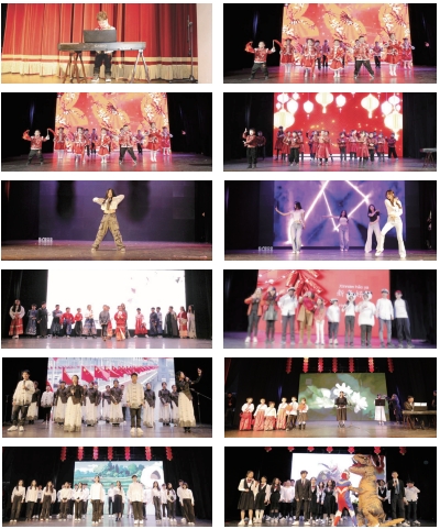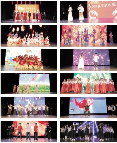 此次联欢晚会表演涵盖了龙年吉祥、生龙活虎、龙腾四海、龙的传人四个主题,演出活动中有来自六年级同学诵演的《我有祖国,我有母语》、二年级同学展示的朗诵说唱《童说节气》等语言类节目;在舞蹈类节目中,有舞蹈高班带来的敦煌舞蹈作品《沁莲》、五年级同学表演的《小小中国龙》等;另有对外汉语班展现给大家的《马可波罗游》情景剧,还有精彩的歌曲串烧《我和我的祖国》、《七里香》、《夜空中最亮的星》等。整个演出充满了多样化的艺术形式,给观众带来了一场视听盛宴。