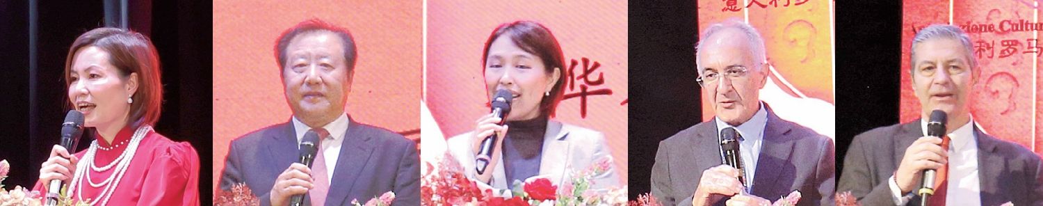 从左至右分别为罗马中华语言学校校长蒋忠华发言;中国常驻联合国粮农机构代表、大使广德福发言;中国驻意大利大使馆领侨处主任张婵发言;意大利知名校长卡罗·西波隆发言;罗马市政府国际关系办公室主任、市长国际事务顾问乌戈·帕比发言。(图片来源:本文图片均来自欧洲时报实习记者张云舒)