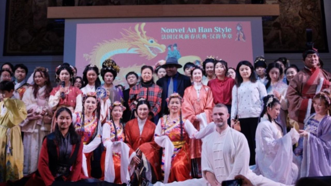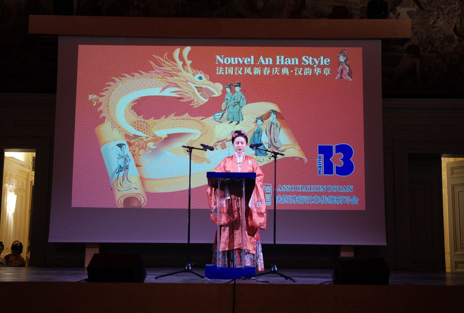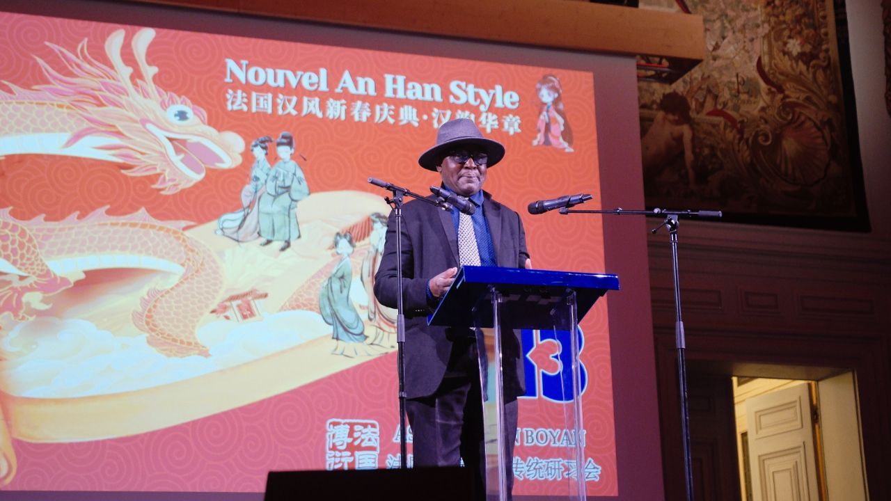 2024年2月9日除夕跨年之夜,第五届法国汉风新春盛典《汉韵华章》在巴黎市政府13区礼堂圆满落幕,联合国教科文组织协会的大区代表罗伯特. 福帕先生(Robert Fopa)、巴黎十三区区长顾梅先生(Jérôme Coumet)、议员Daniel Tran,法国博衍汉章传统研习会会长仲月茹(仲巾函)为跨年盛典致辞。