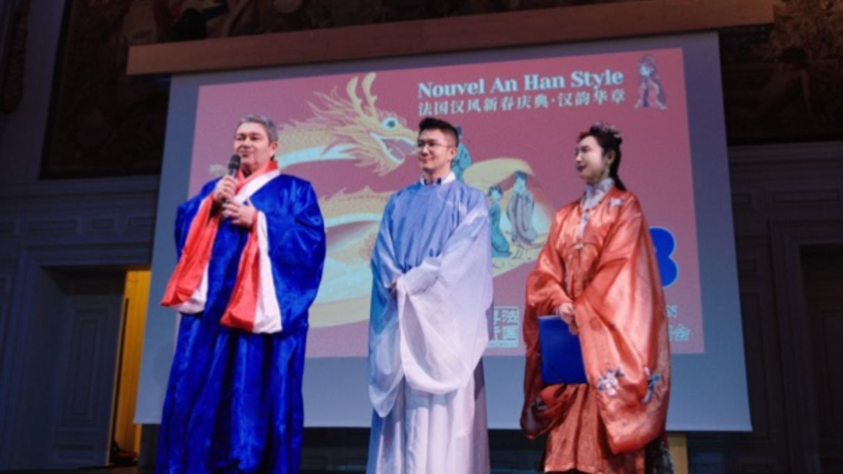 今年,他再次穿上了来自非遗传承人手工制作的汉服登场,这是一套法兰西国旗色的真丝道袍,由法国博衍汉章传统研习会仲会长,现场赠送给了区长先生,这将成为巴黎13区政府的“100件有意义的物件”历史展品之一。Daniel Tran议员先生身穿另一套“海神龙君”圆领袍的汉服登场祝贺,在兔随冬去、龙伴春来的除夕之夜,十分契合龙年新春主题。