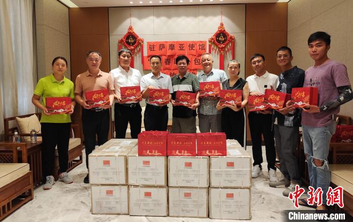中国驻萨摩亚使馆向侨胞赠送春节“暖心包”。