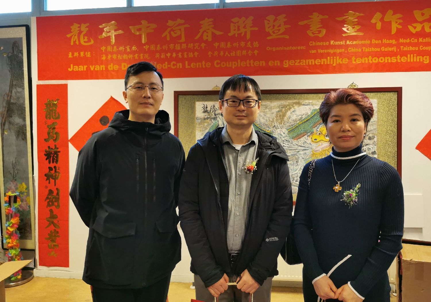 荷兰温州华人华侨联谊会会长池素洁(右1)与中国驻荷兰使馆领事部主任叶锐(左2)、马天秘书(左1)在浙里有爱庆祝启动仪式上合影留念。
