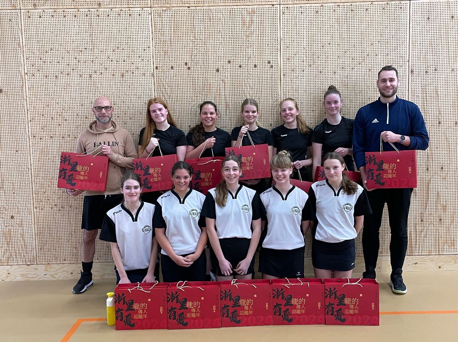 图为荷兰弗里斯兰体育学校学生在拿到池素洁会长赠送的文化礼盒后与礼品盒合影留念。